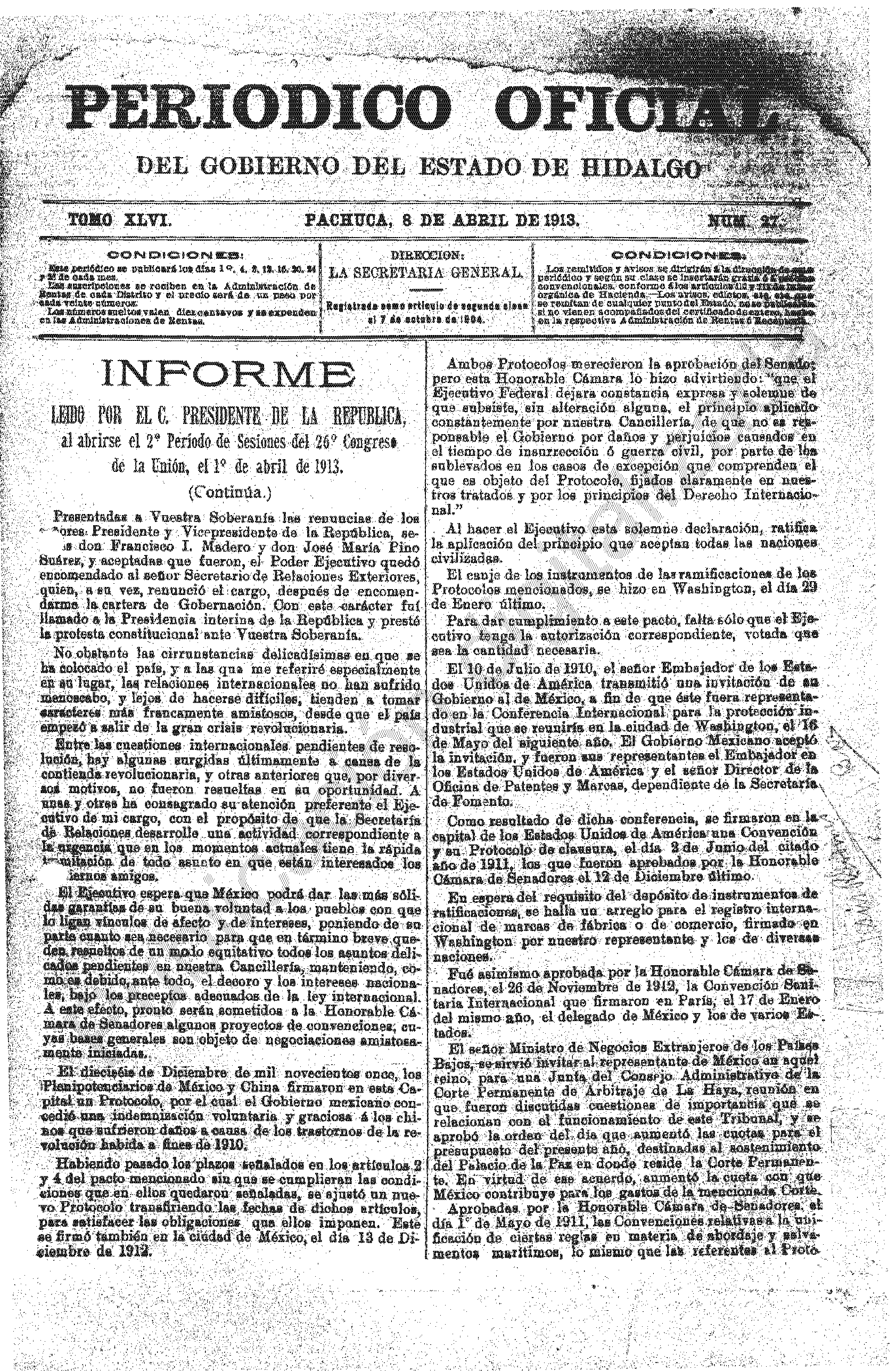 Descargar Periódico Oficial Ordinario 0 del 08 de abril de 1913El portal web del Periódico Oficial del Estado de hidalgo es el único medio de difusión oficial del Gobierno del Estado de Hidalgo