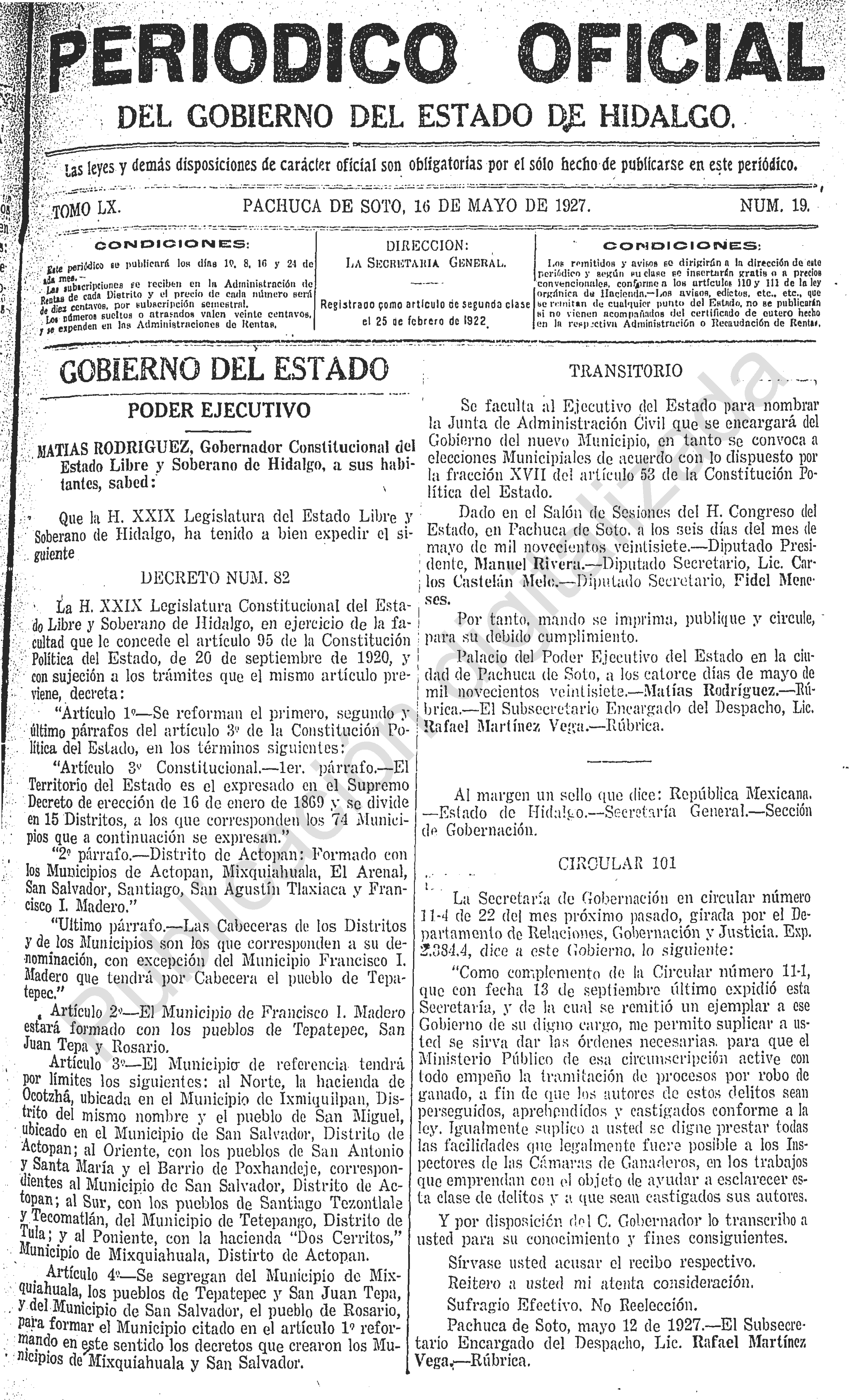 • Decreto Núm. 82.- Reforma a la Constitución Politica del Estado de Hidalgo, se divide en 15 distritos y 74 Municipios.