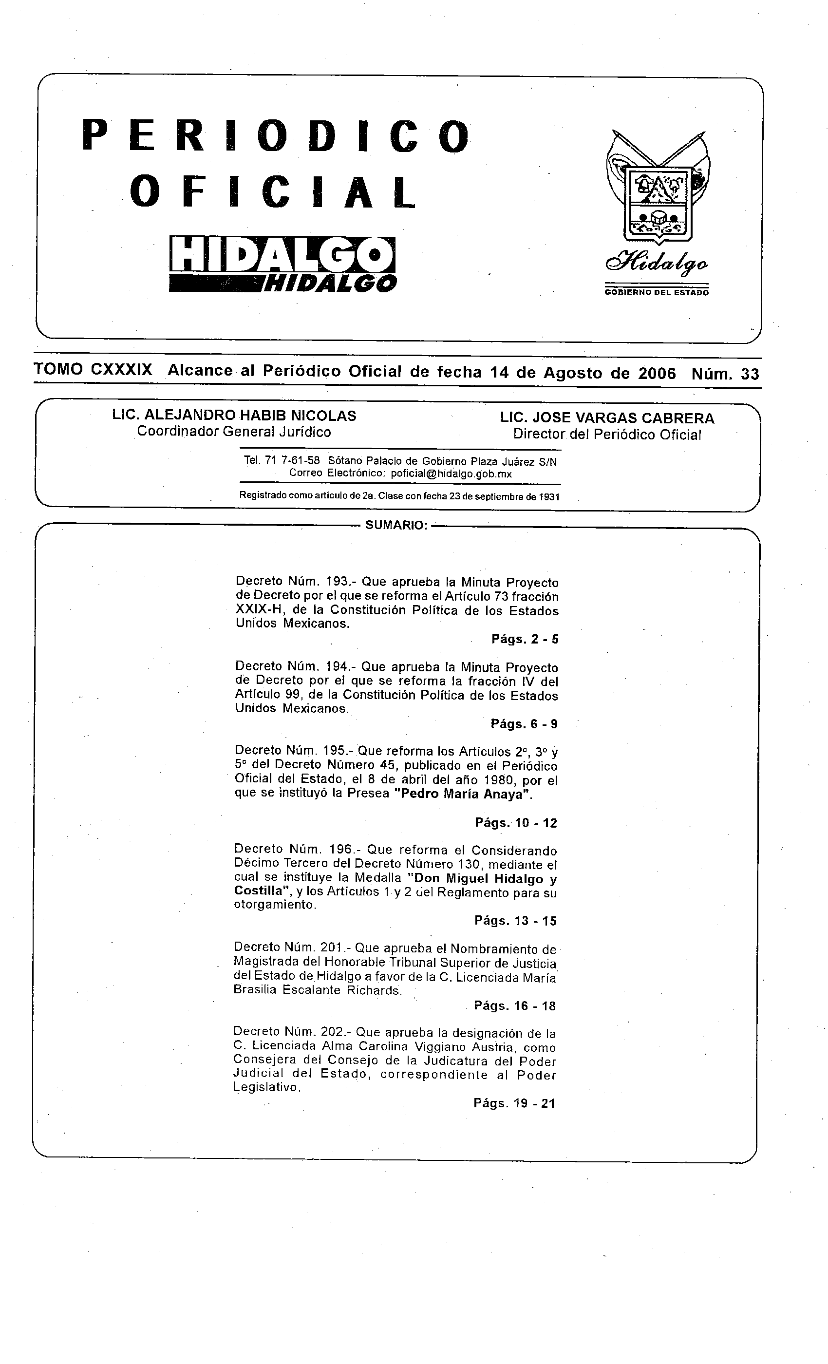- Decreto Núm. 201.- Que aprueba el Nombramiento de Magistrada del Honorable Tribunal Superior de Justicia del Estado de Hidalgo a favor de la C. Licenciada María Brasilia Escalante Richards.