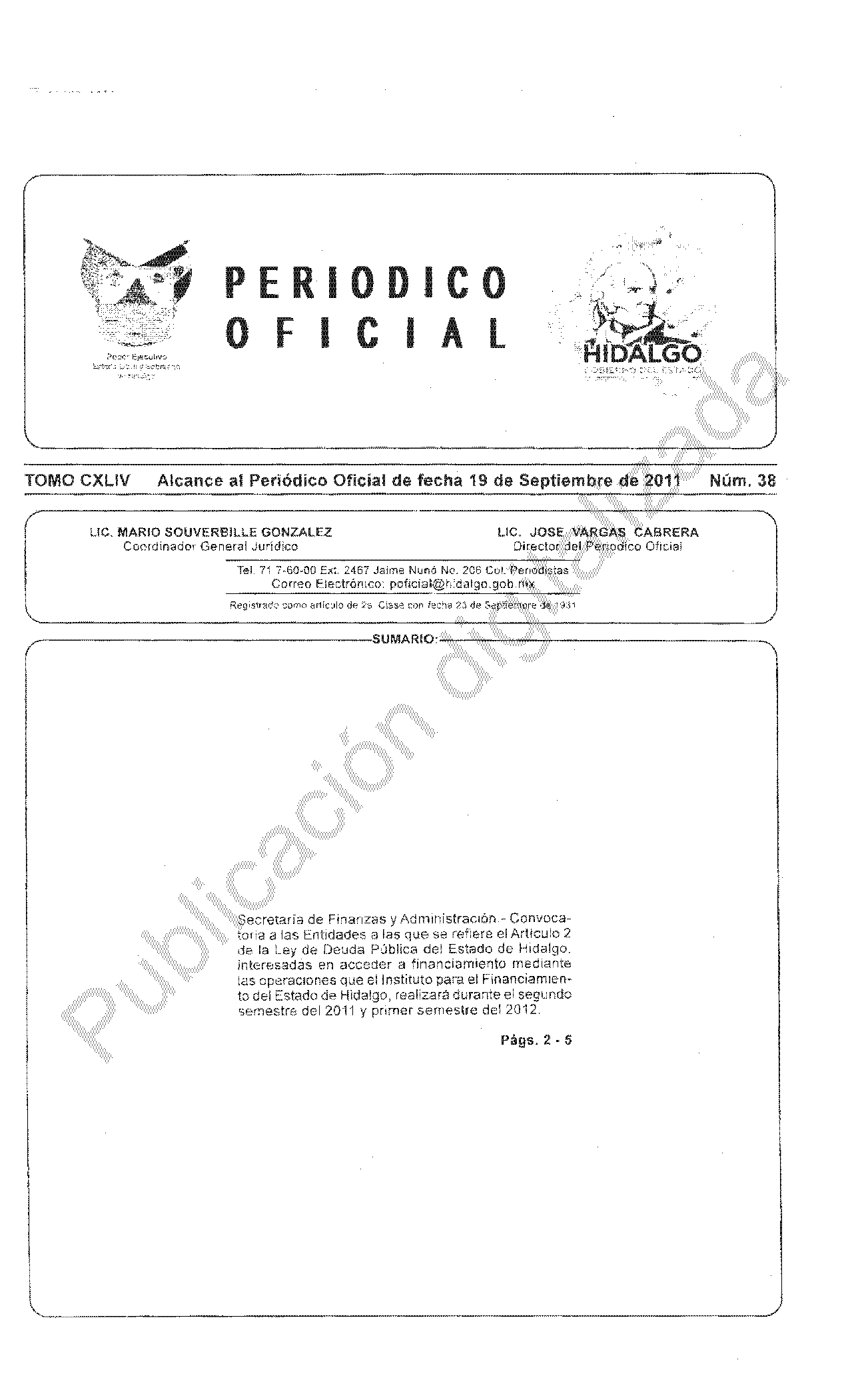 Descargar Periódico Oficial Alcance 0 del 19 de septiembre de 2011El portal web del Periódico Oficial del Estado de hidalgo es el único medio de difusión oficial del Gobierno del Estado de Hidalgo