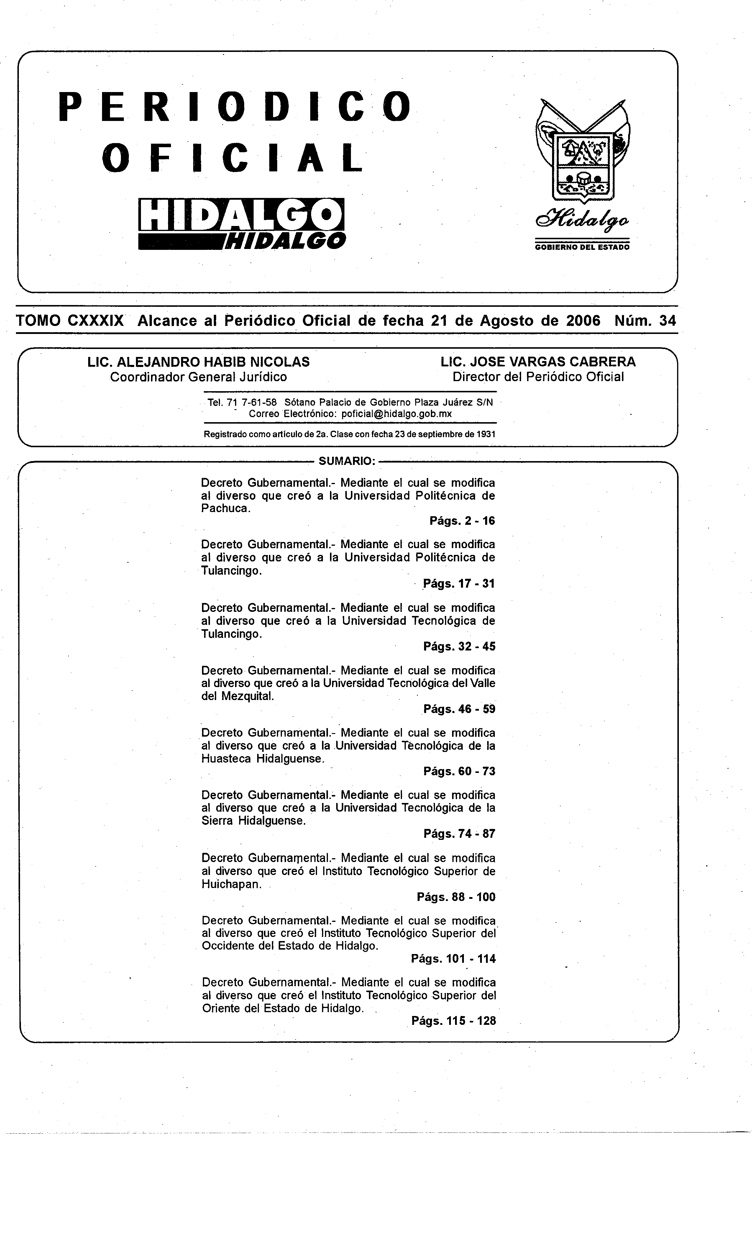 • Decreto Gubernamental.- Mediante el cual se modifica al diverso que creó a la Universidad Politécnica de Pachuca.