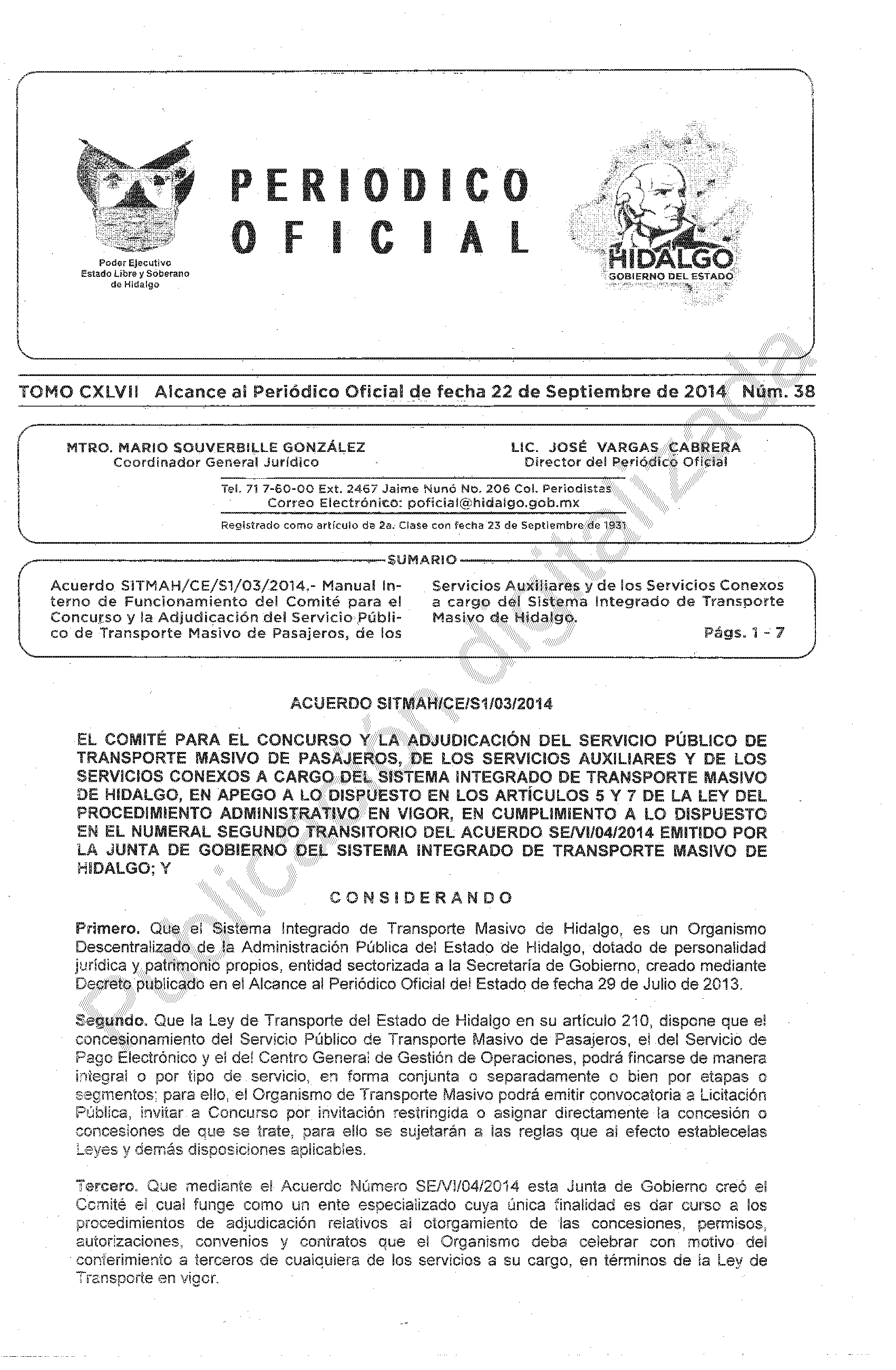 - Acuerdo SITMAH/CE/S1/03/2014.- Manual Interno de Funcionamiento del Comité para el Concurso y la Adjudicación del Servicio Público de Transporte Masivo de Pasajeros, de los Servicios Auxiliares y de los Servicios Conexos a cargo del Sistema Integrado de Transporte Masivo de Hidalgo.