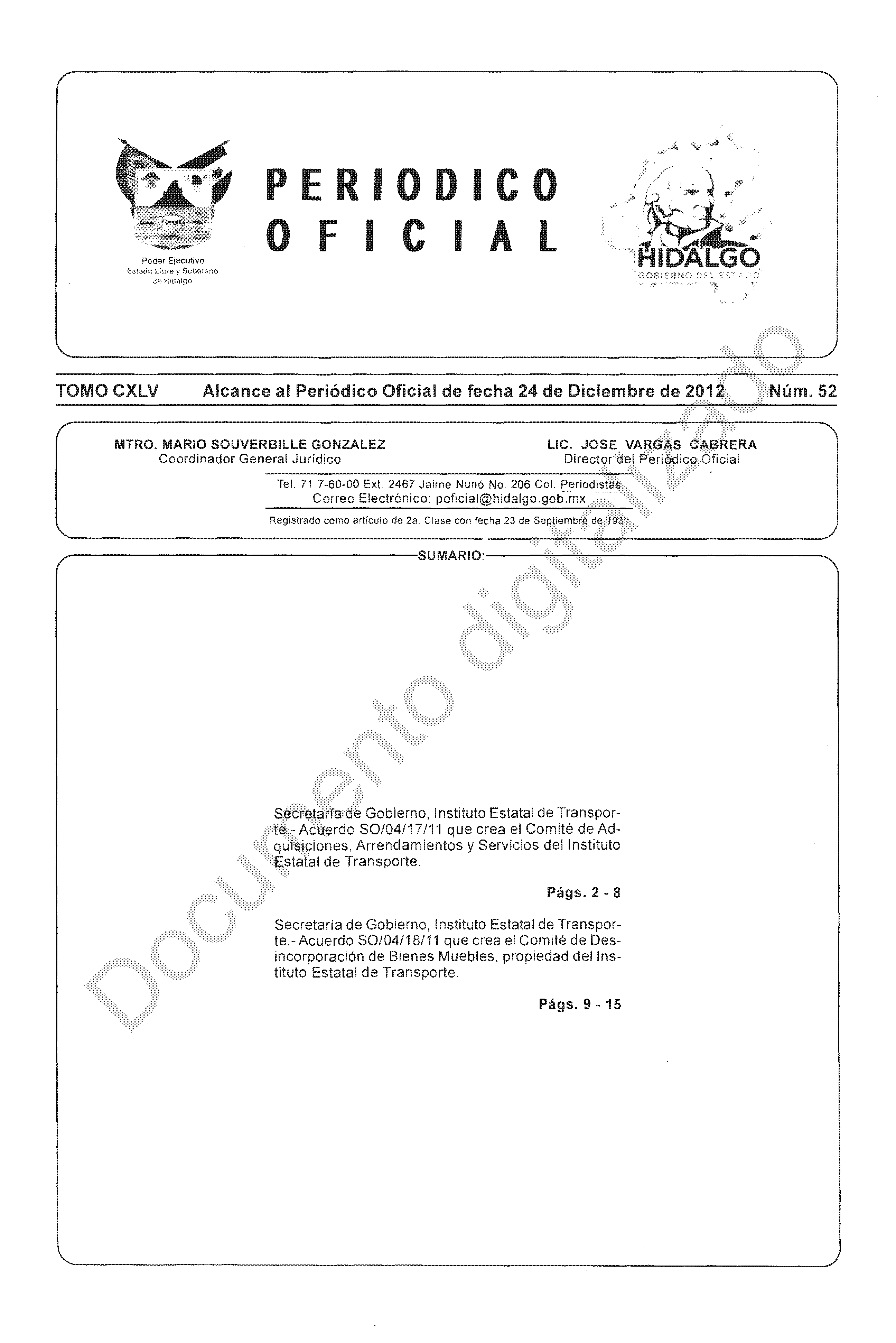 Descargar Periódico Oficial Alcance 0 del 24 de diciembre de 2012