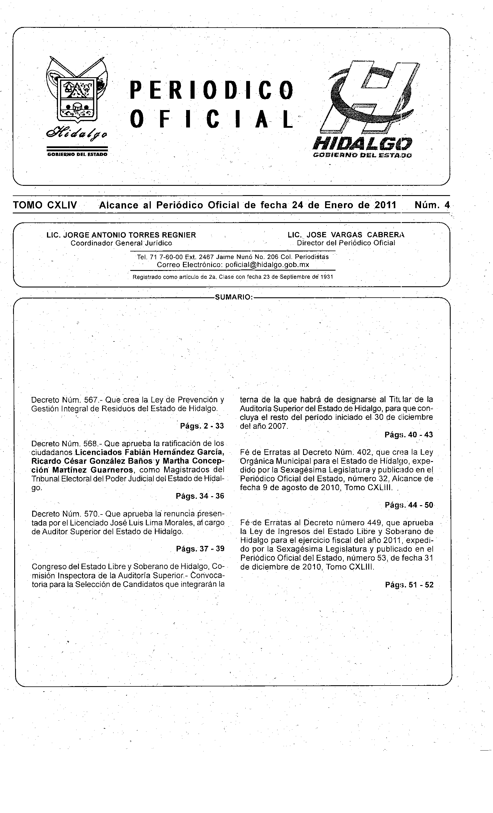 - Fé de Erratas al Decreto Núm. 402, que crea la Ley Orgánica Municipal para el Estado de Hidalgo, expedido por la Sexagésima Legislatura y publicado en el Periódico Oficial del Estado, número 53, de fecha 31 de diciembre de 2010, Tomo CXLIII.