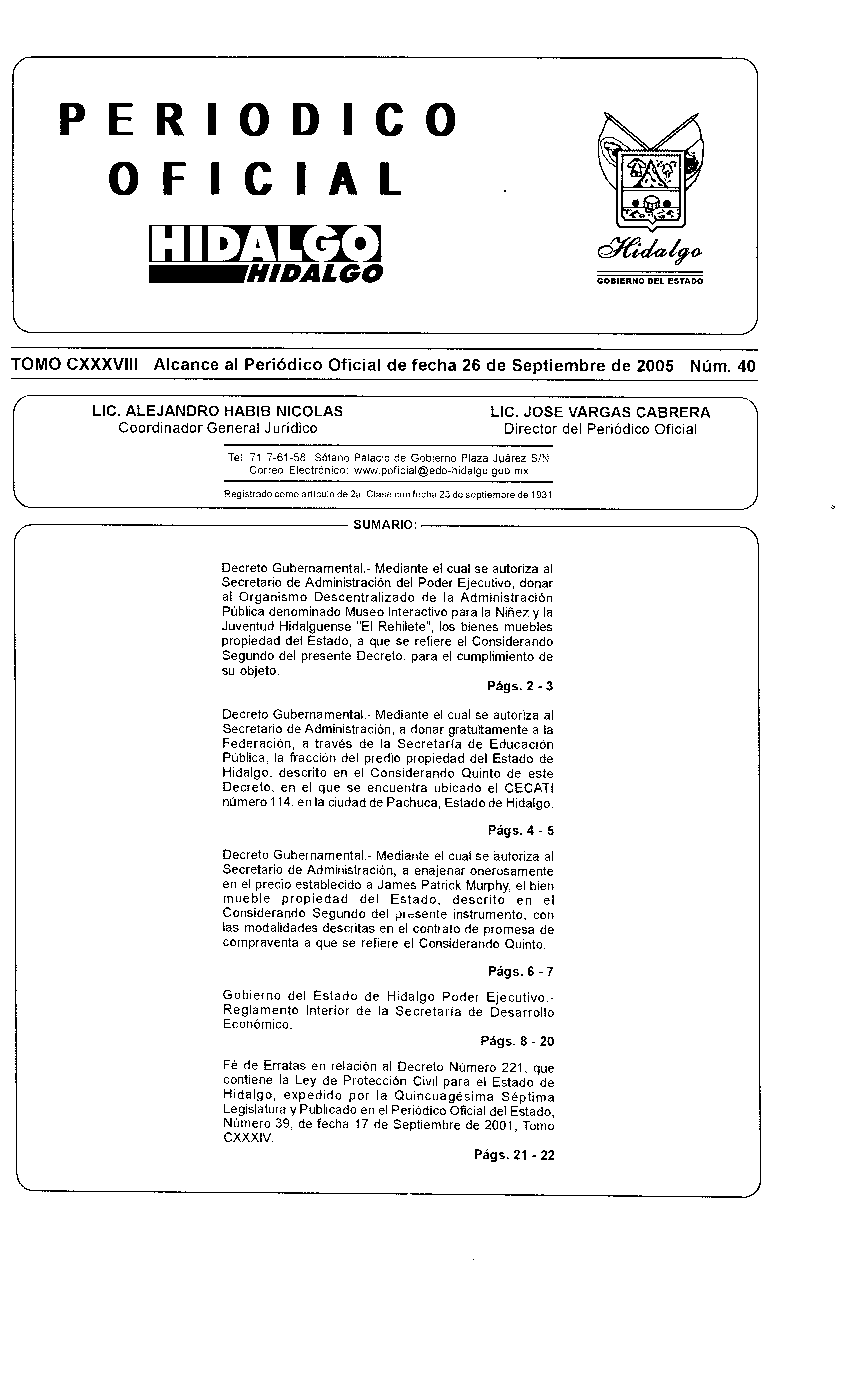 - Fe de Erratas en relación al Decreto Número 221, que contiene la Ley de Protección Civil para el Estado de Hidalgo, expedido por la Quincuagésima Séptima Legislatura y Publicado en el Periódico Oficial del Estado, Número 39, de fecha 17 de Septiembre de 2001, Tomo CXXXIV.