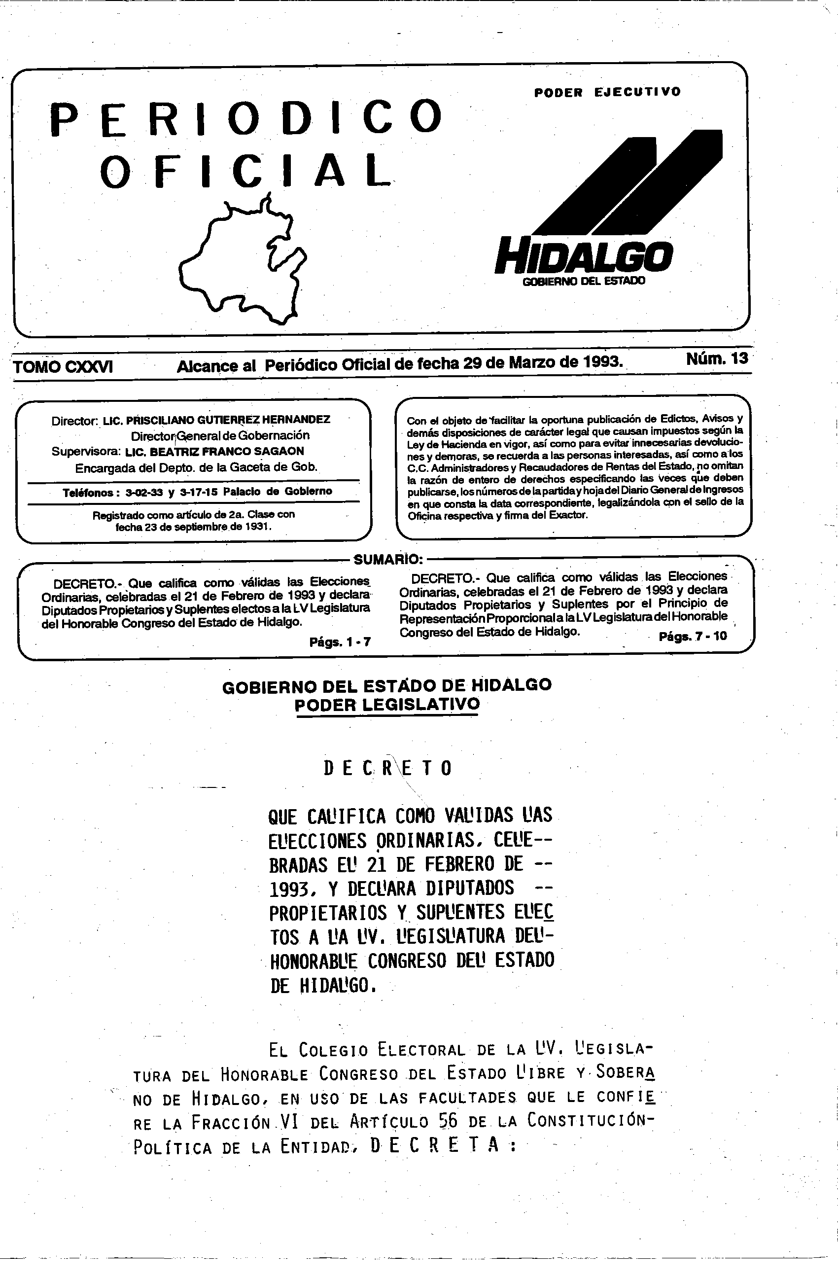 • Decreto.- Que califica como válidas las Elecciones Ordinarias, celebradas el 21 de Febrero de 1993 y declara Diputados Propietarios y Suplentes electos a la LV Legislatura del Honorable Congreso del Estado de Hidalgo.