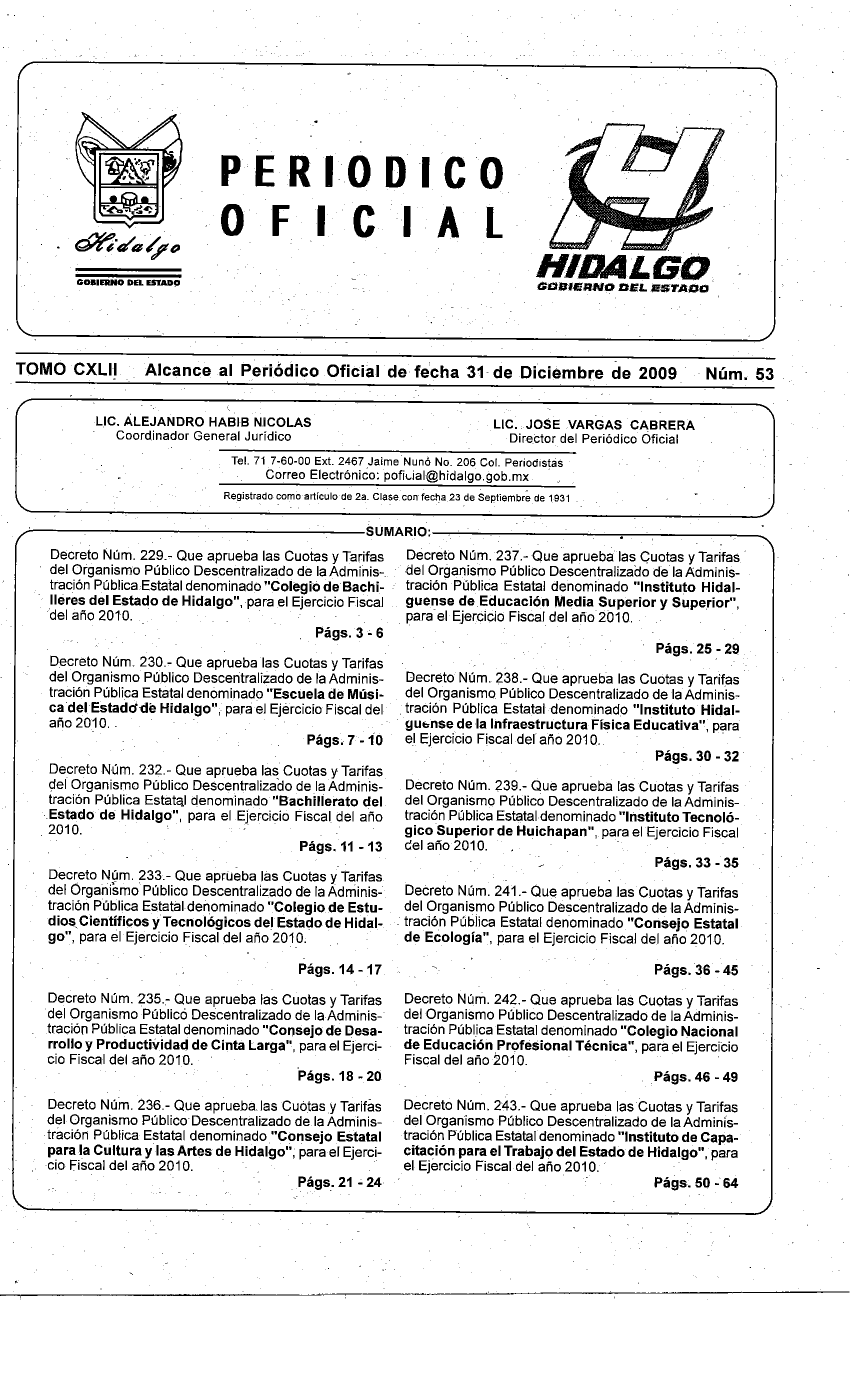 - Decreto Núm. 229.- Que aprueba las Cuotas y Tarifas del Organismo Público Descentralizado de la Administración Pública Estatal denominado “Colegio de Bachilleres del Estado de Hidalgo”, para el Ejercicio Fiscal del año 2010.