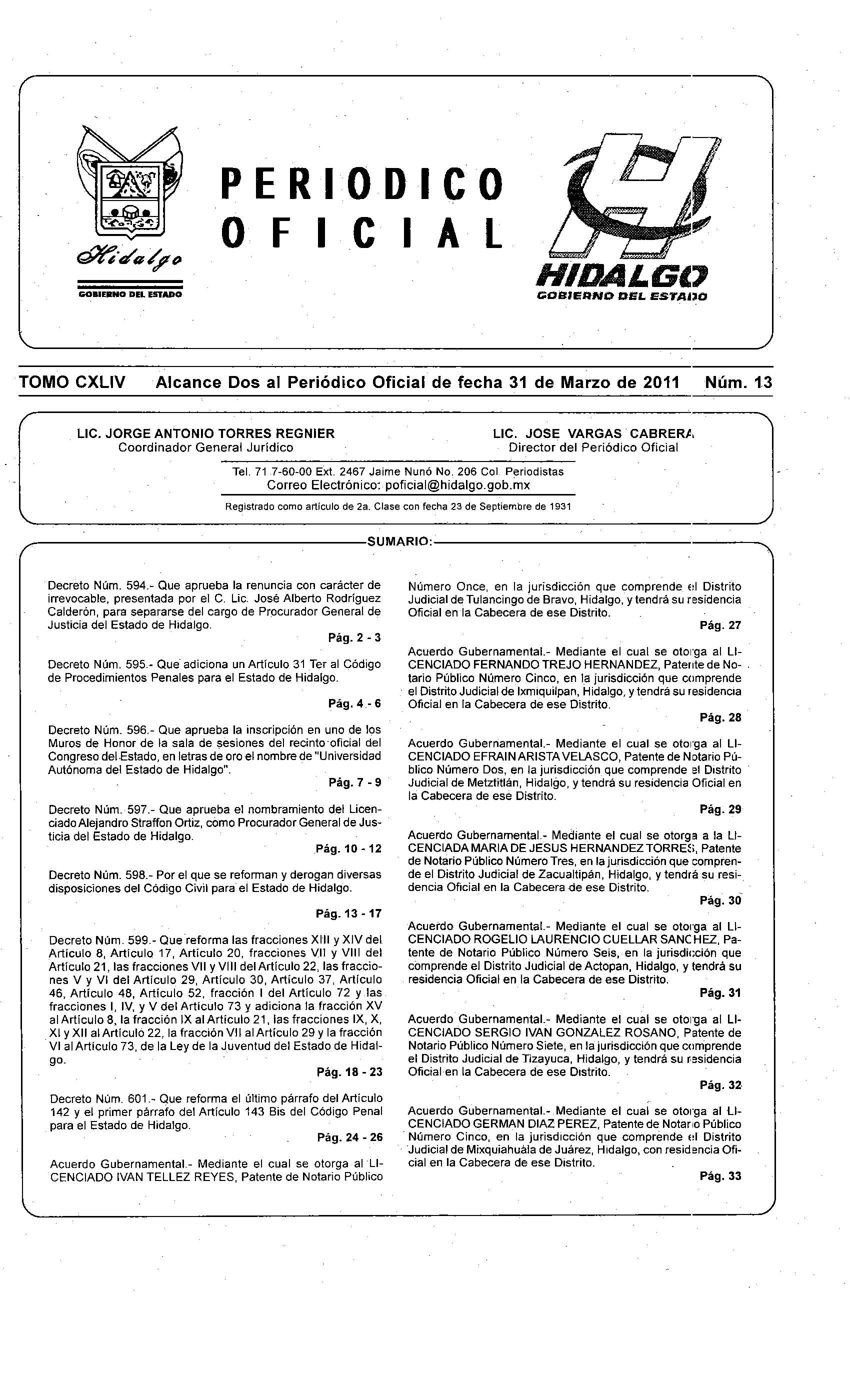 • Decreto Núm. 594.- Que aprueba la renuncia con carácter de irrevocable, presentada por el C. Lic. José Alberto Rodríguez Calderón, para separarse del cargo de Procurador General de Justicia del Estado de Hidalgo.