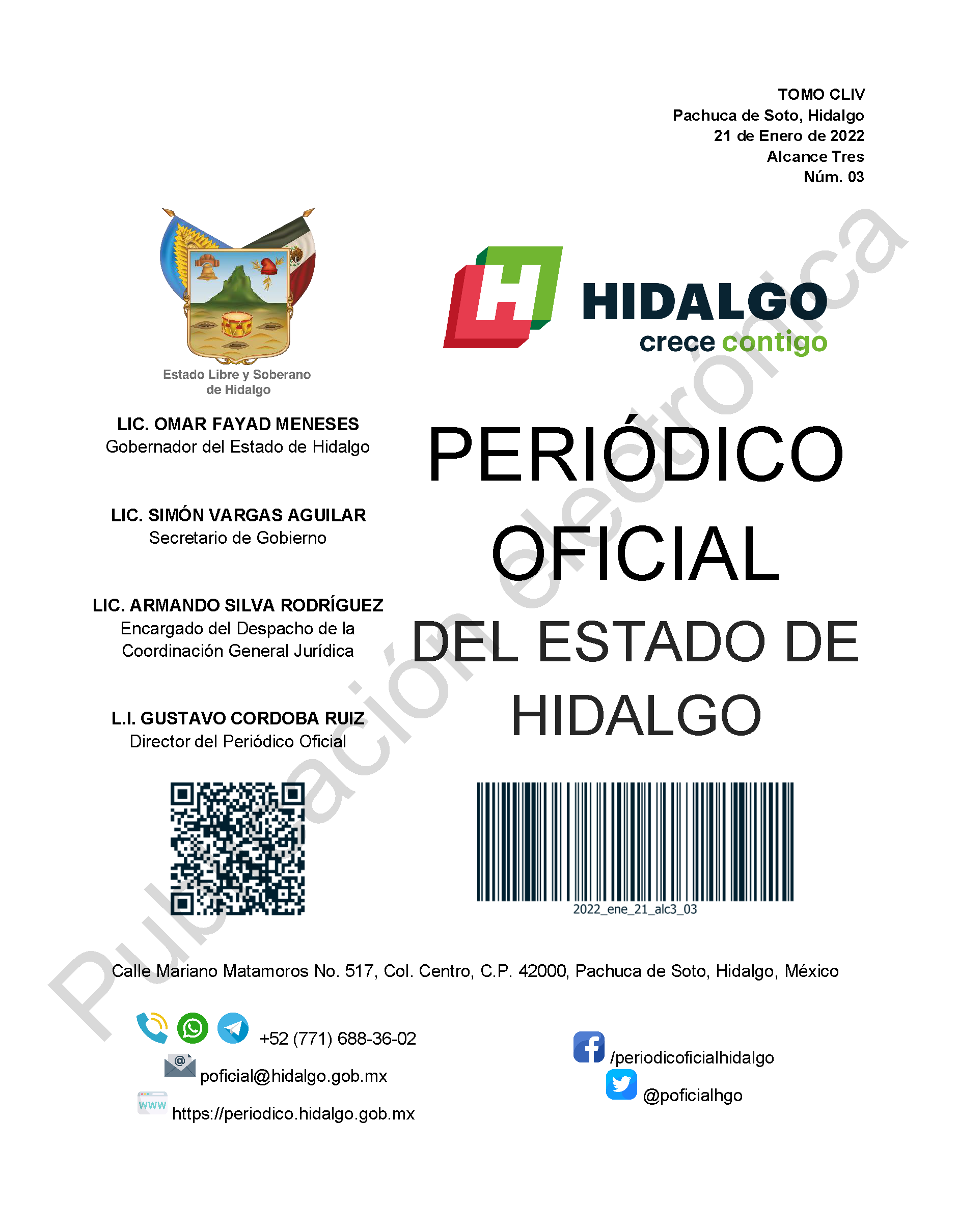 Descargar Periódico Oficial Alcance 3 del 21 de enero de 2022El portal web del Periódico Oficial del Estado de hidalgo es el único medio de difusión oficial del Gobierno del Estado de Hidalgo