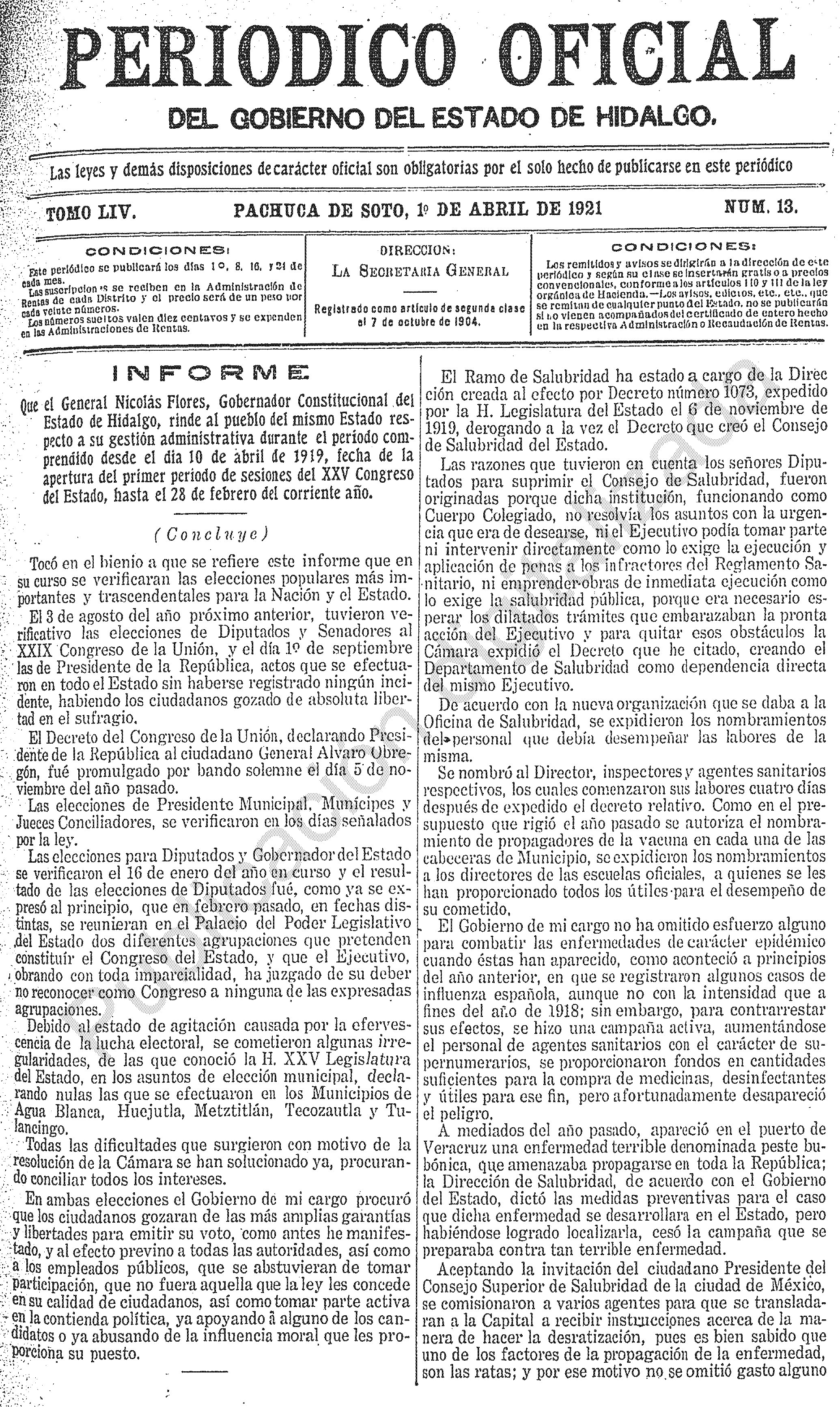 • Informe, que el general Nicolas Flores, Gobernador Constitucional del Estado de Hidalgo, rinde al pueblo, respecto de su gestión administrativa durante el periodo comprendido desde el día 10 de abril de 1919 hasta el 28 de febrero del corriente año.