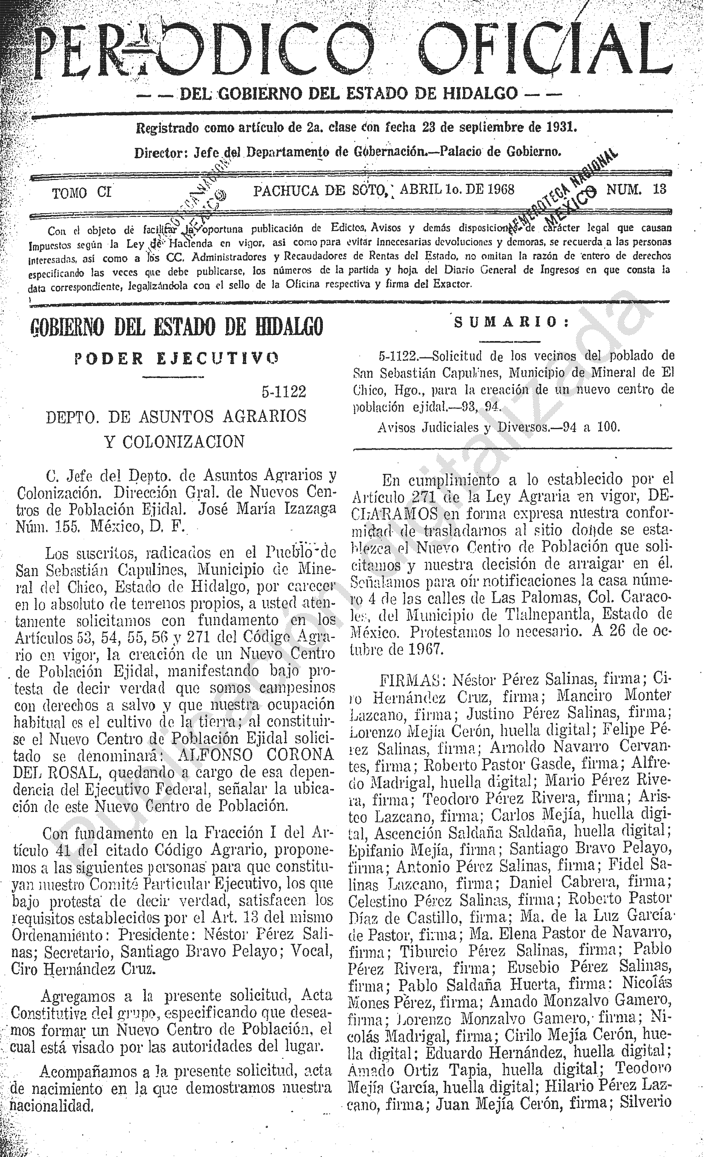 - 5-1122.- Solicitud de los vecinos del poblado de San Sebastián Capulines, Municipio de Mineral de El Chico, Hgo., para la creación de un nuevo centro de población ejidal.