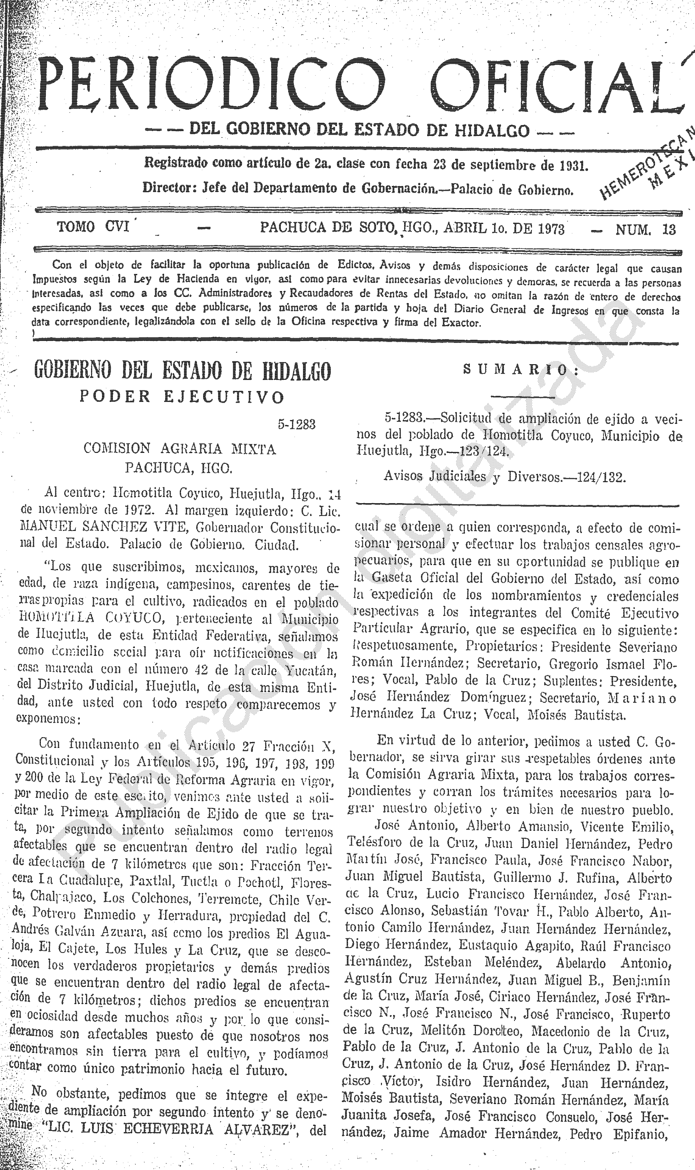 • 5-1283.- Solicitud de ampliación de ejido a vecinos del poblado de Homotitla Coyuco, Municipio de Huejutla, Hgo.