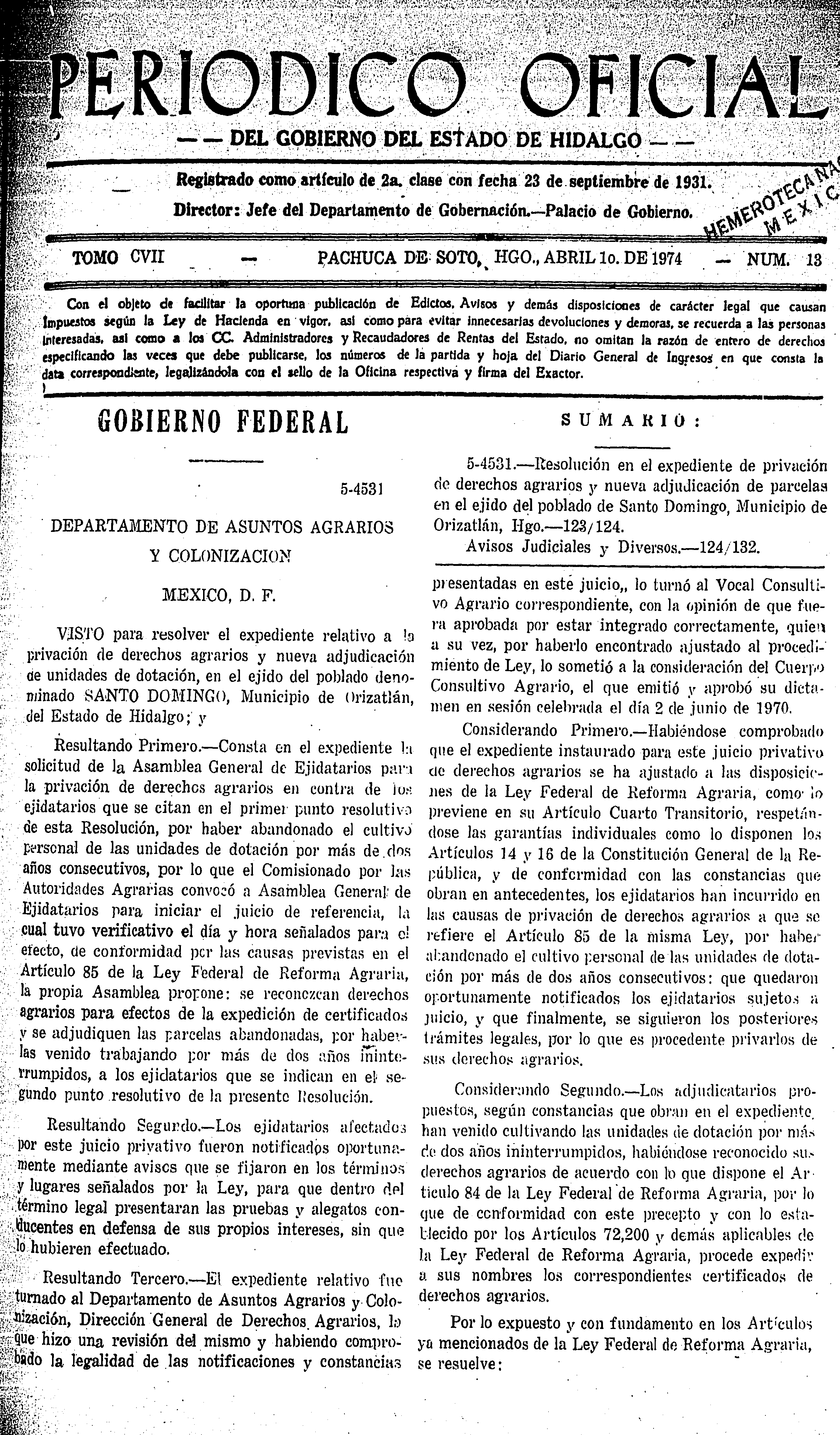 • 5-4531.- Resolución en el expediente de privación de derechos agrarios y nueva adjudicación de parcelas en el ejido del poblado de Santo Domingo, Municipio de Orizatlán, Hgo.