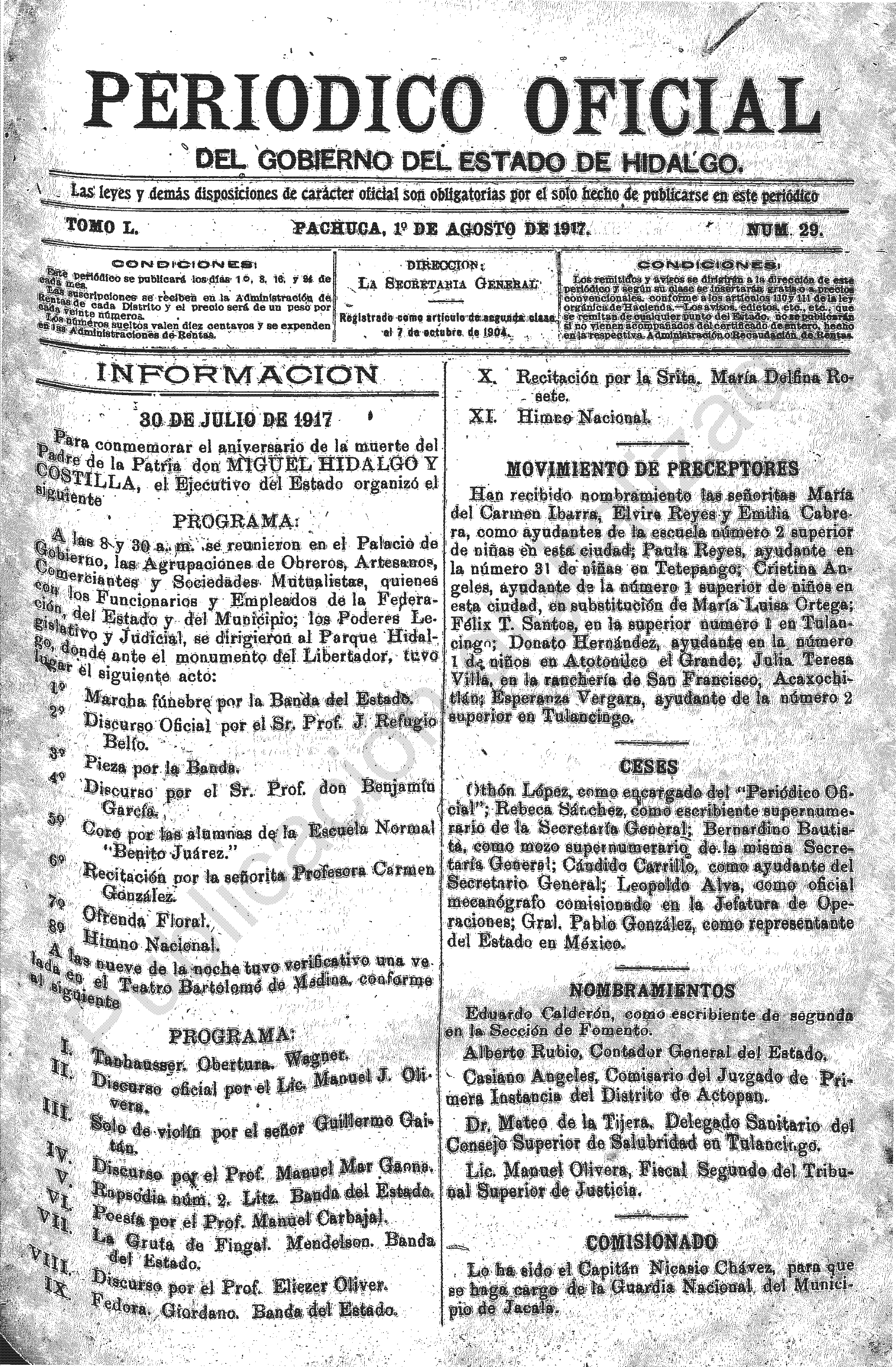 Descargar Periódico Oficial ordinario 0 del 01 de agosto de 1917Tamaño 3.86 MB