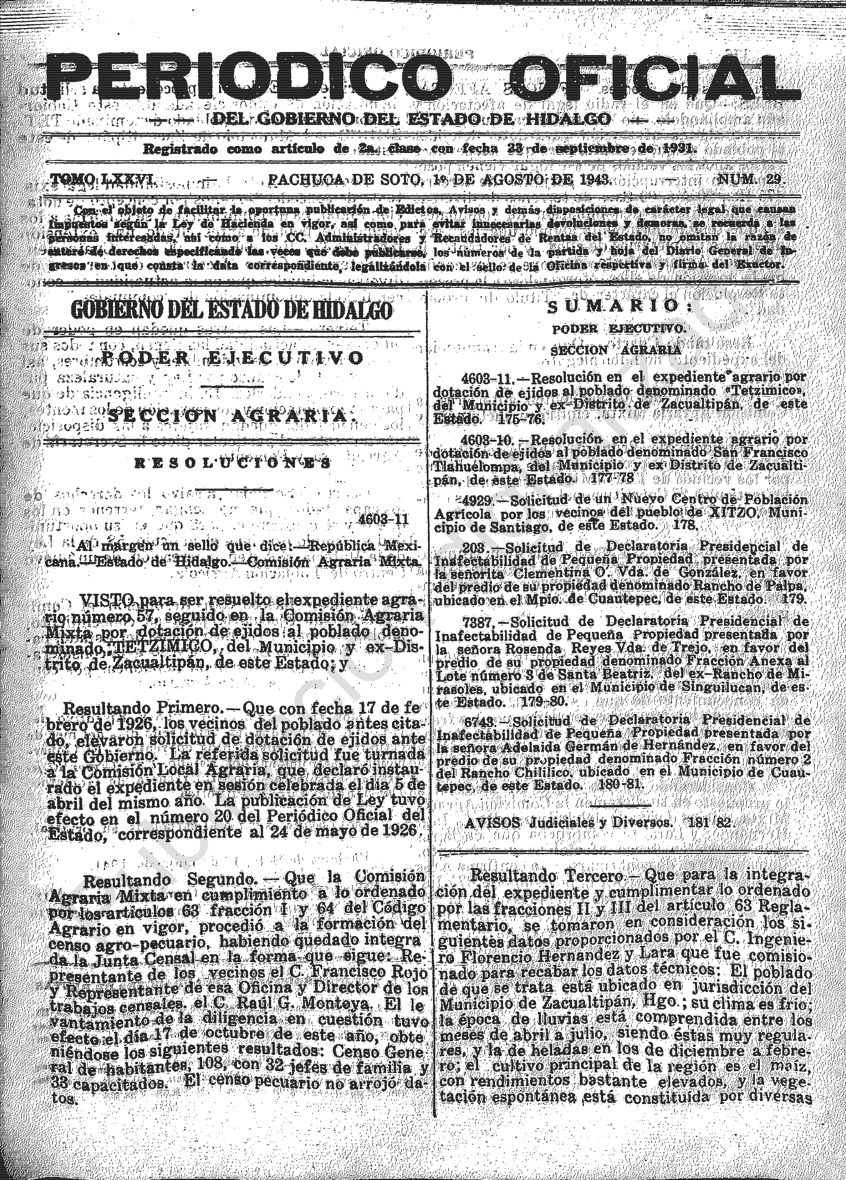 - 4603-11.- Resolución en el expediente agrario por dotación de ejidos al poblado denominado “Tetzimico”, del Municipio y ex Distrito de Zacualtipán, de este Estado.