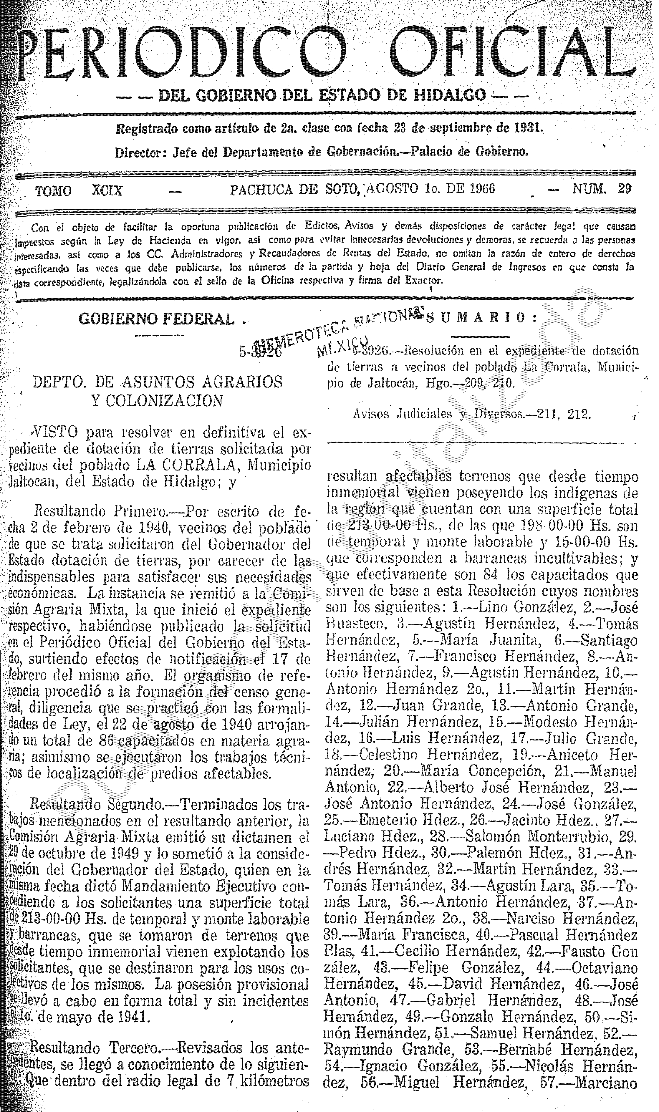 • 5-3926.- Resolución en el expediente de dotación de tierras a vecinos del poblado La Corrala, Municipio de Jaltocán, Hgo.