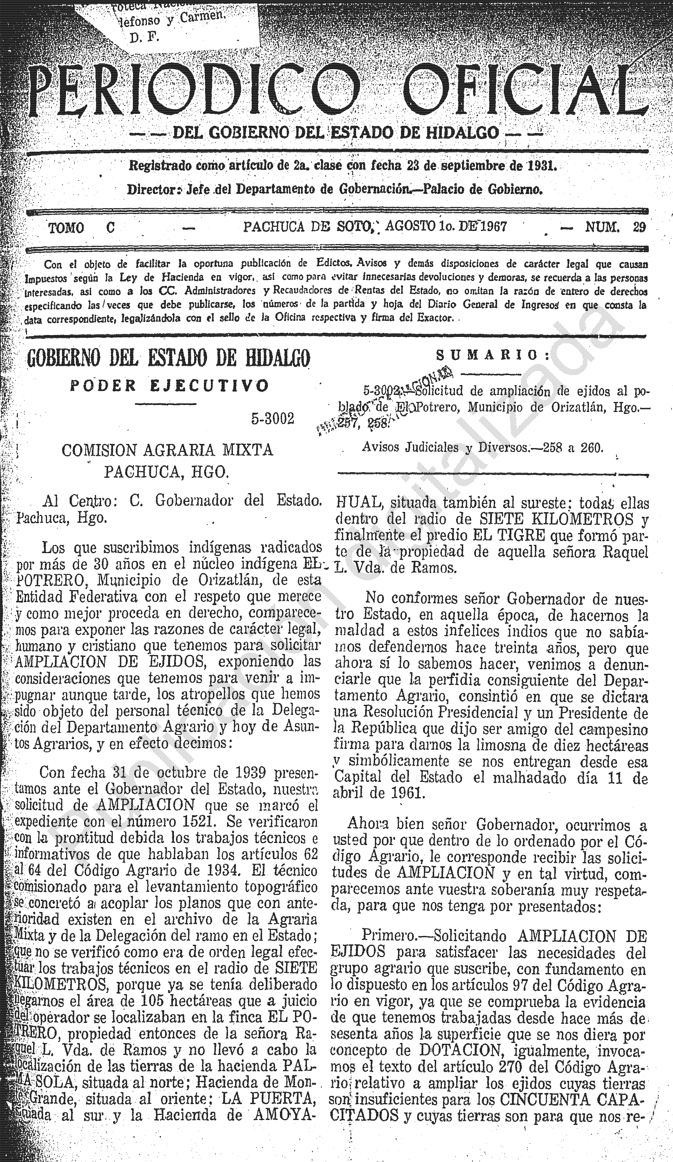 - 5-3002.- Solicitud de ampliación de ejidos al poblado de El Potrero, Municipio de Orizatlán, Hgo.