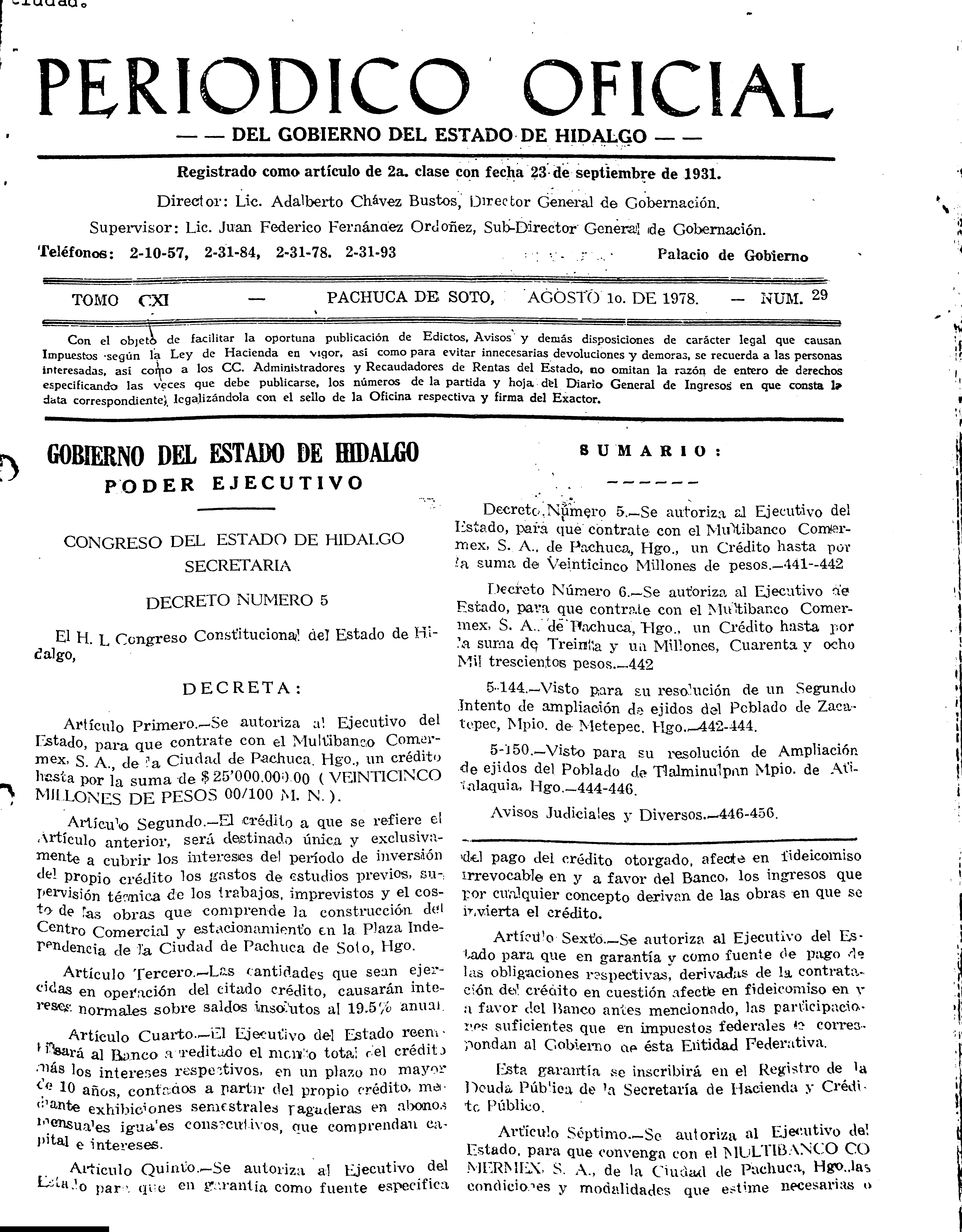 • Decreto Número 5.- Se autoriza al Ejecutivo del Estado, para que contrate con el Multibanco Comermex, S.A., de Pachuca, Hgo., un crédito hasta por la suma de Veinticinco Millones de Pesos.
