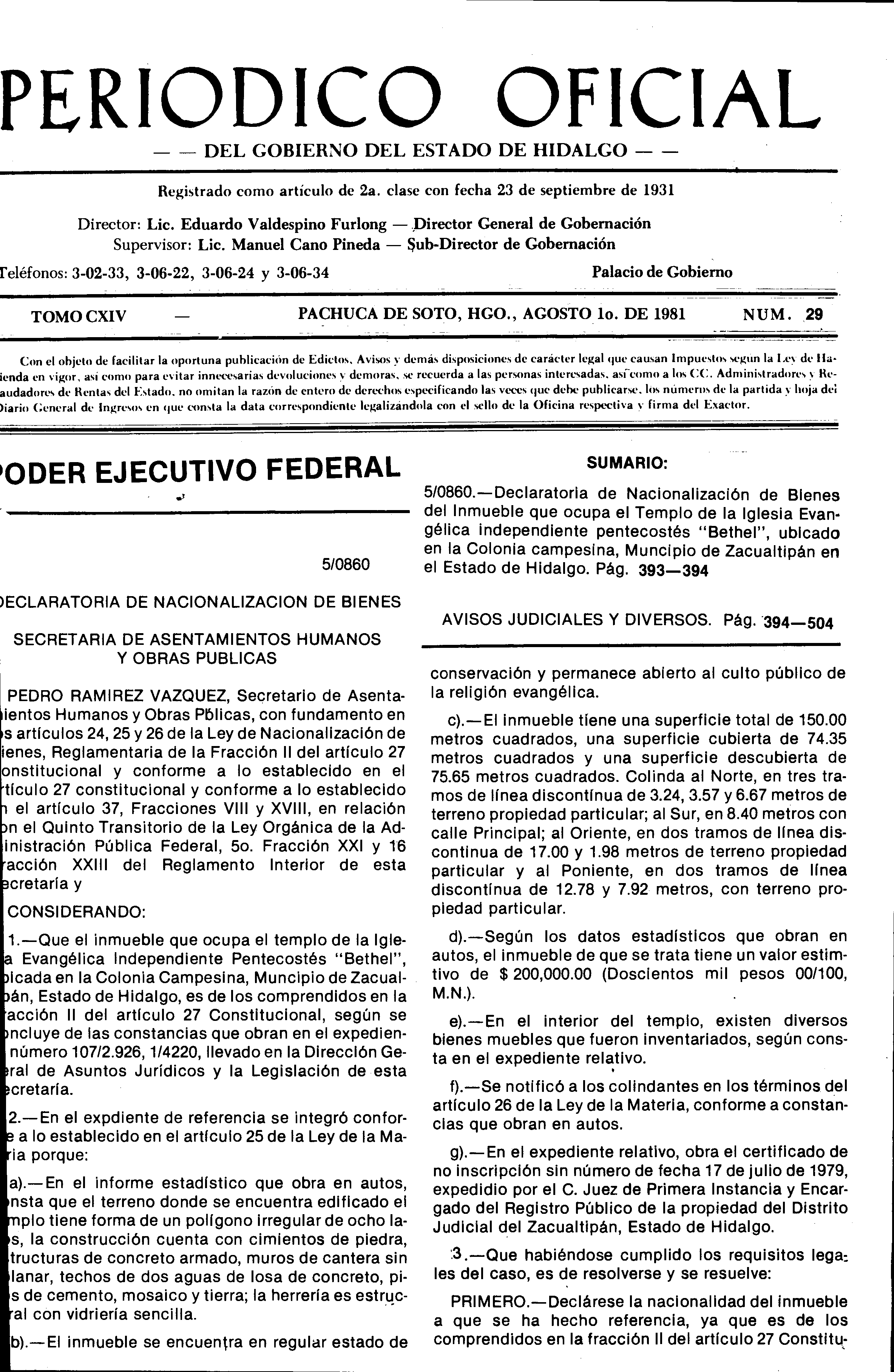 • 5/0860.- Declaratoria de Nacionalización de Bienes del Inmueble que ocupa el Tempo de la Iglesia Evangélica independiente pentecostés “Bethel”, ubicado en la Colonia campesina, Municipio de Zacualtipán en el Estado de Hidalgo.