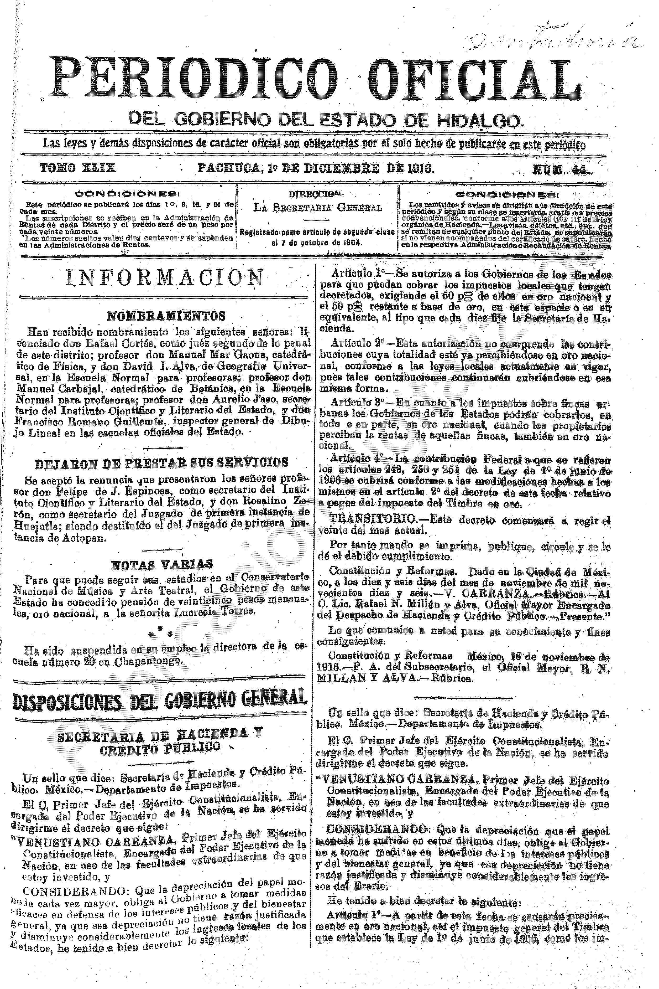 Descargar Periódico Oficial Ordinario 0 del 01 de diciembre de 1916Tamaño 1.11 MB