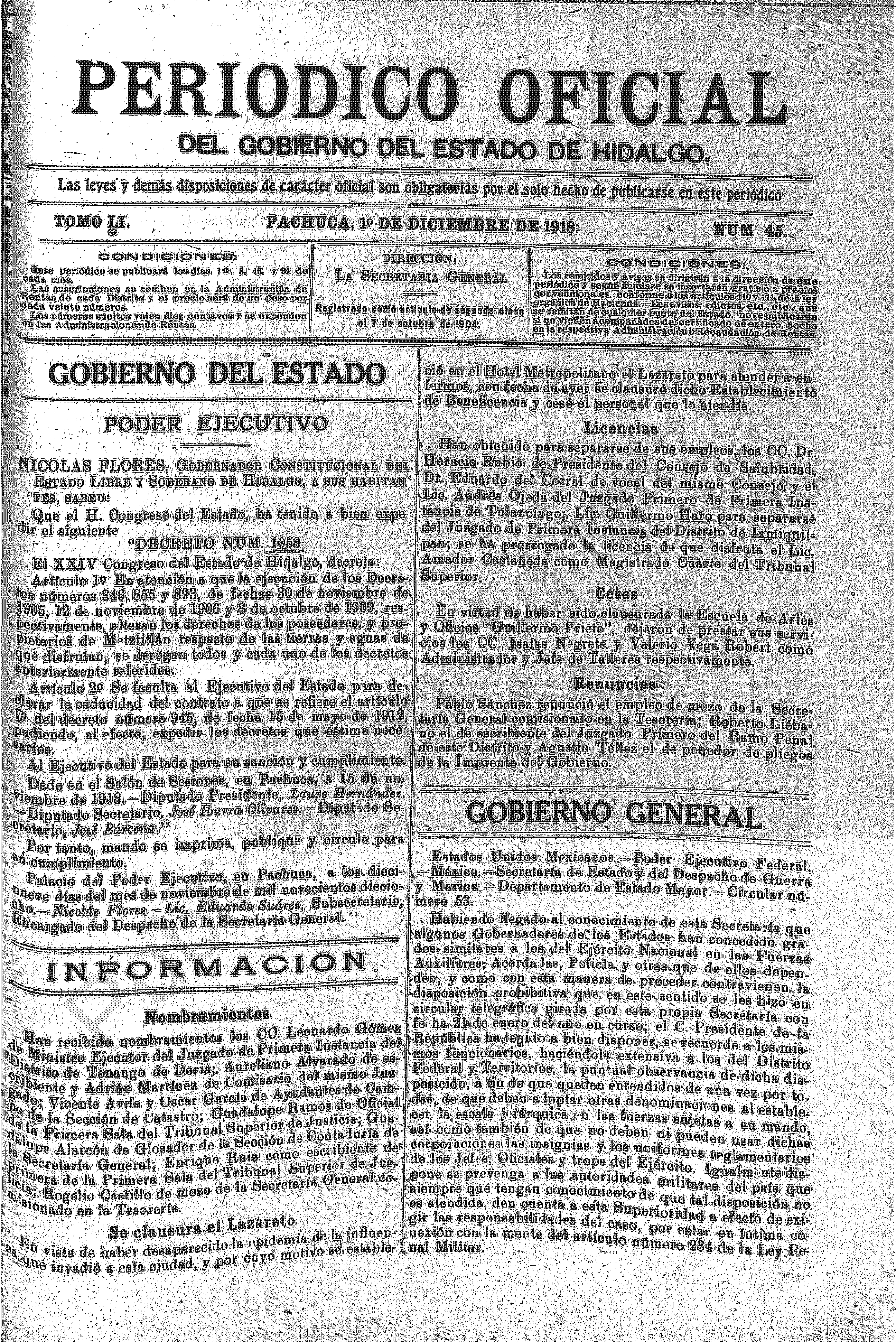 • Poder Ejecutivo, Nicolas Flores, Gobernador Constitucional del Estado Libre y Soberano de Hidalgo, Decreto número 1059, por el que en atención a que la ejecución de los decretos números 846, 855 y 893, de fecha 30 de noviembre de 1095, 12 de noviembre de 1906 y 8 de noviembre de 1909, respectivamente, alteran los derechos de los poseedores, y propietarios de Metztitlán respecto de las tierras y aguas de que disfrutan, se derogan todos y cada uno de los decretos anteriormente referidos.