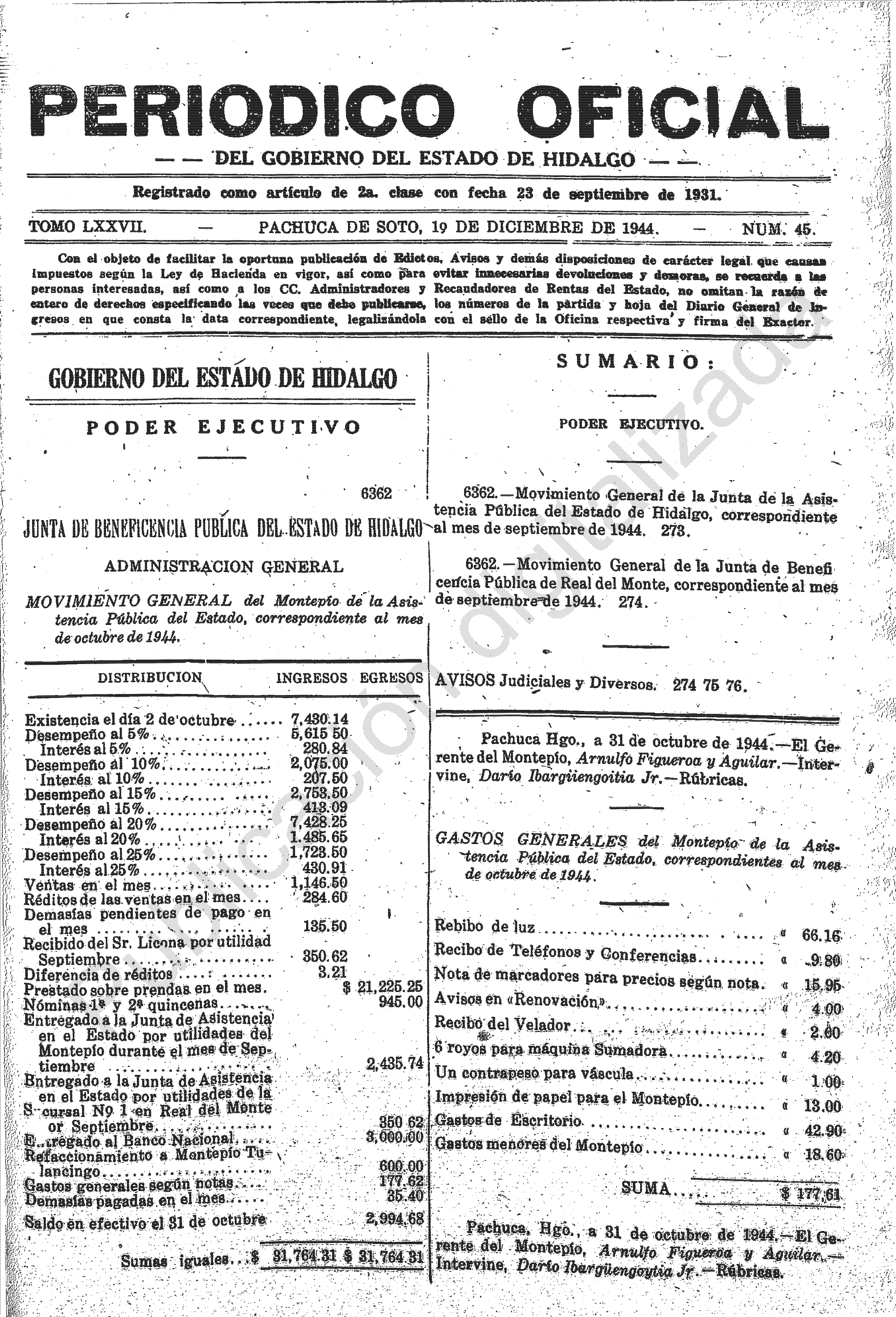 • 6362.- Movimiento General de la Junta de la Asistencia Pública del Estado de Hidalgo, correspondiente al mes de septiembre de 1944.