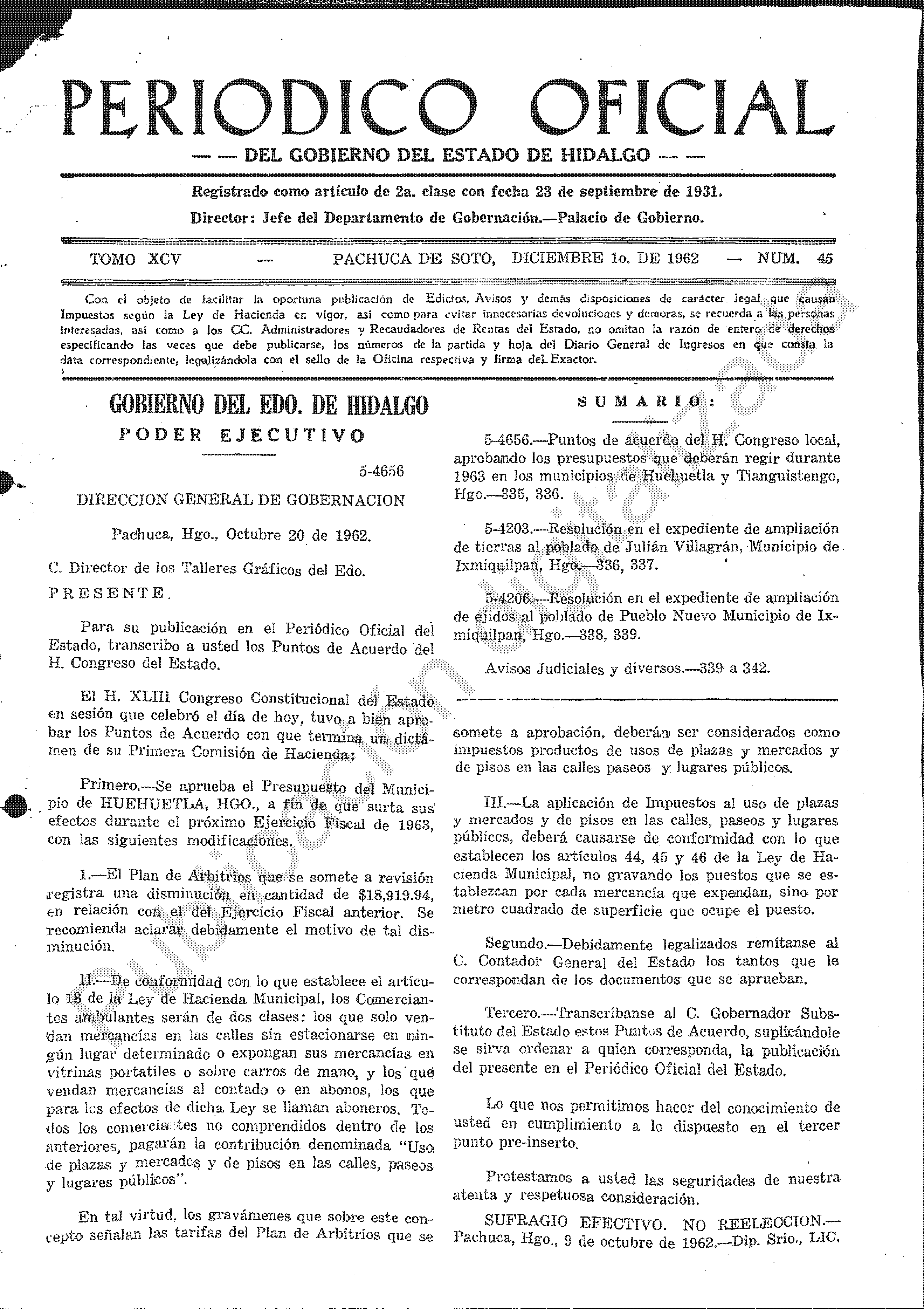 • 5-4656.- Puntos de acuerdo del H. Congreso local, aprobando los presupuestos que deberán regir durante 1963 en los municipios de Huehuetla y Tianguistengo, Hgo.