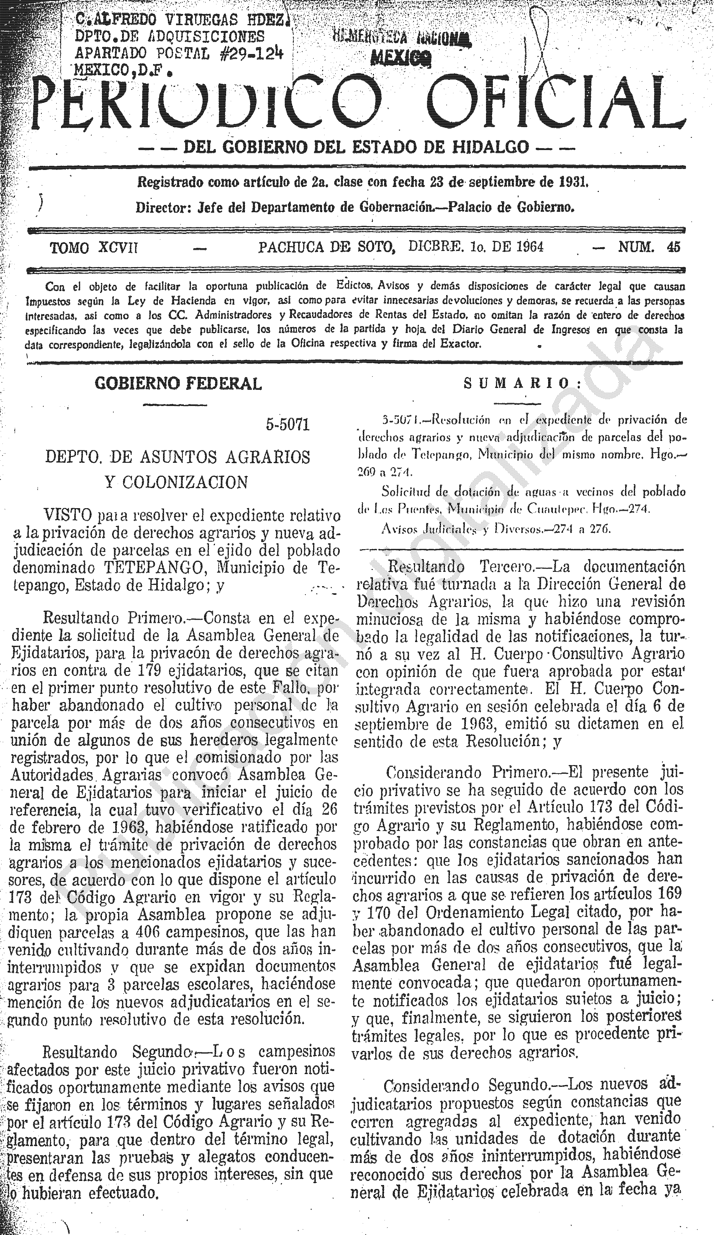 • 5-5071.- Resolución en el expediente de privación de derechos agrarios y nueva adjudicación de parcelas del poblado de Tetepango, Municipio del mismo nombre, Hgo.