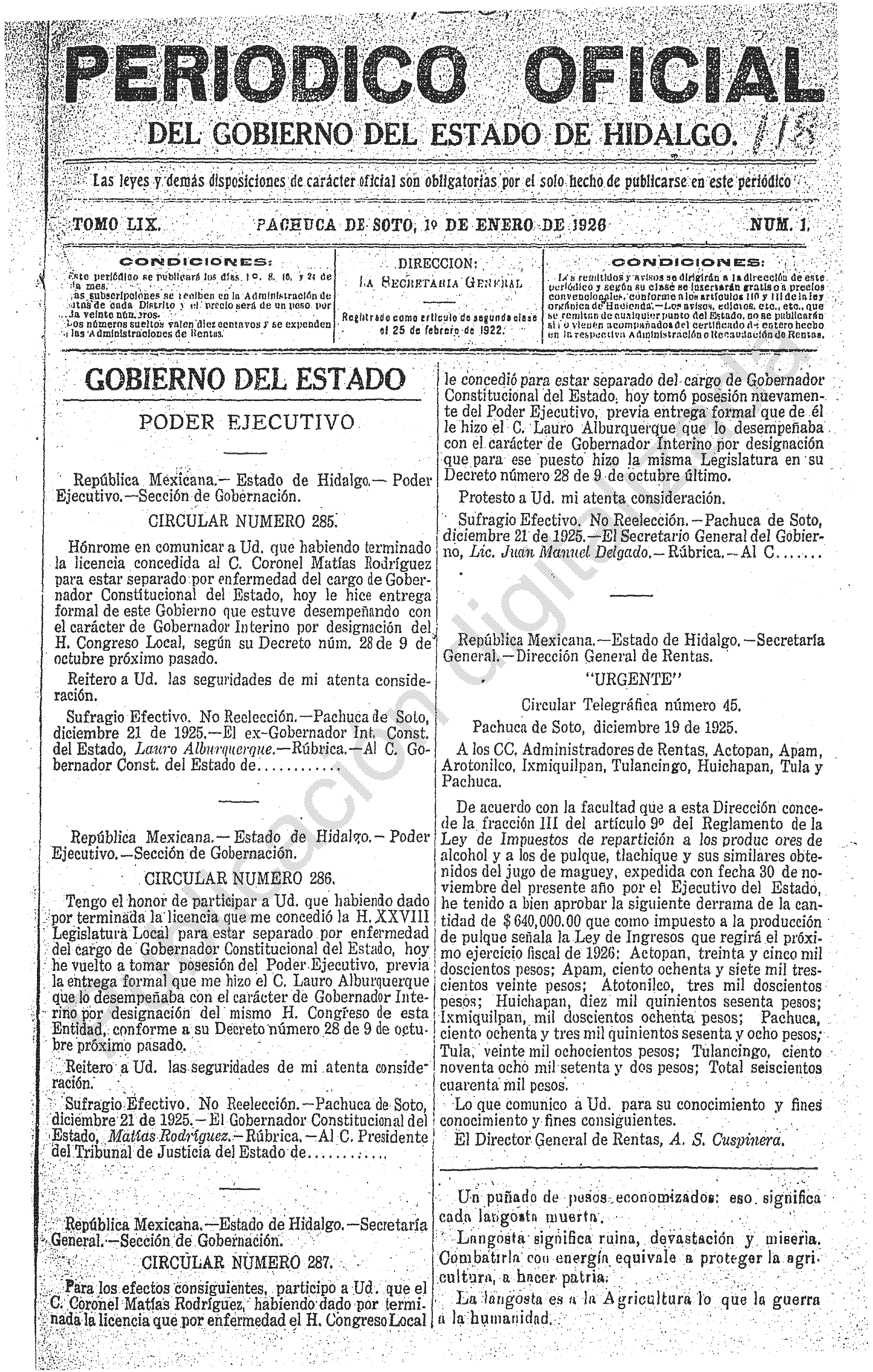 Descargar Periódico Oficial Ordinario 0 del 01 de enero de 1926El portal web del Periódico Oficial del Estado de hidalgo es el único medio de difusión oficial del Gobierno del Estado de Hidalgo