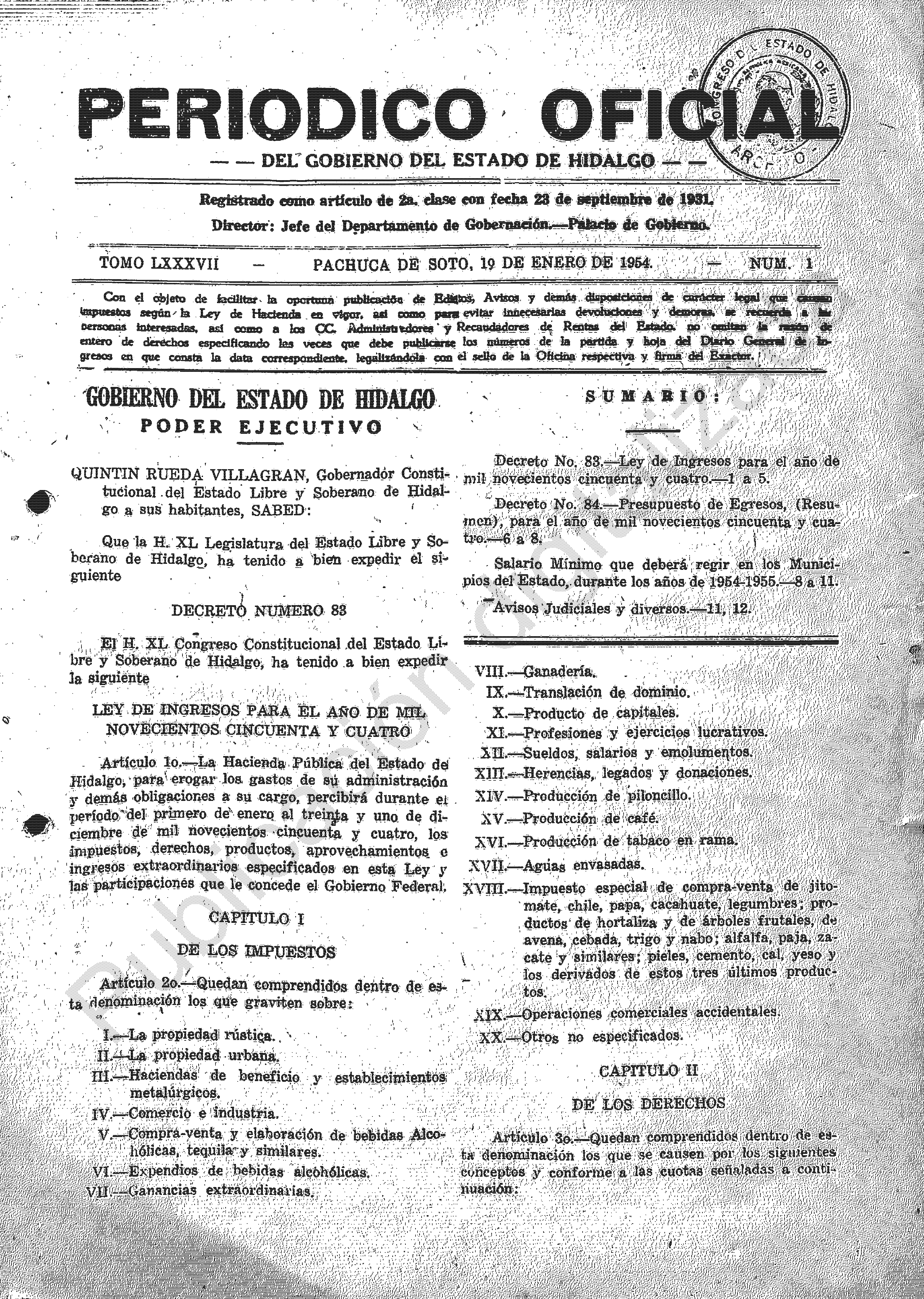 • Decreto No. 83.- Ley de Ingresos para el año de mil novecientos cincuenta y cuatro.