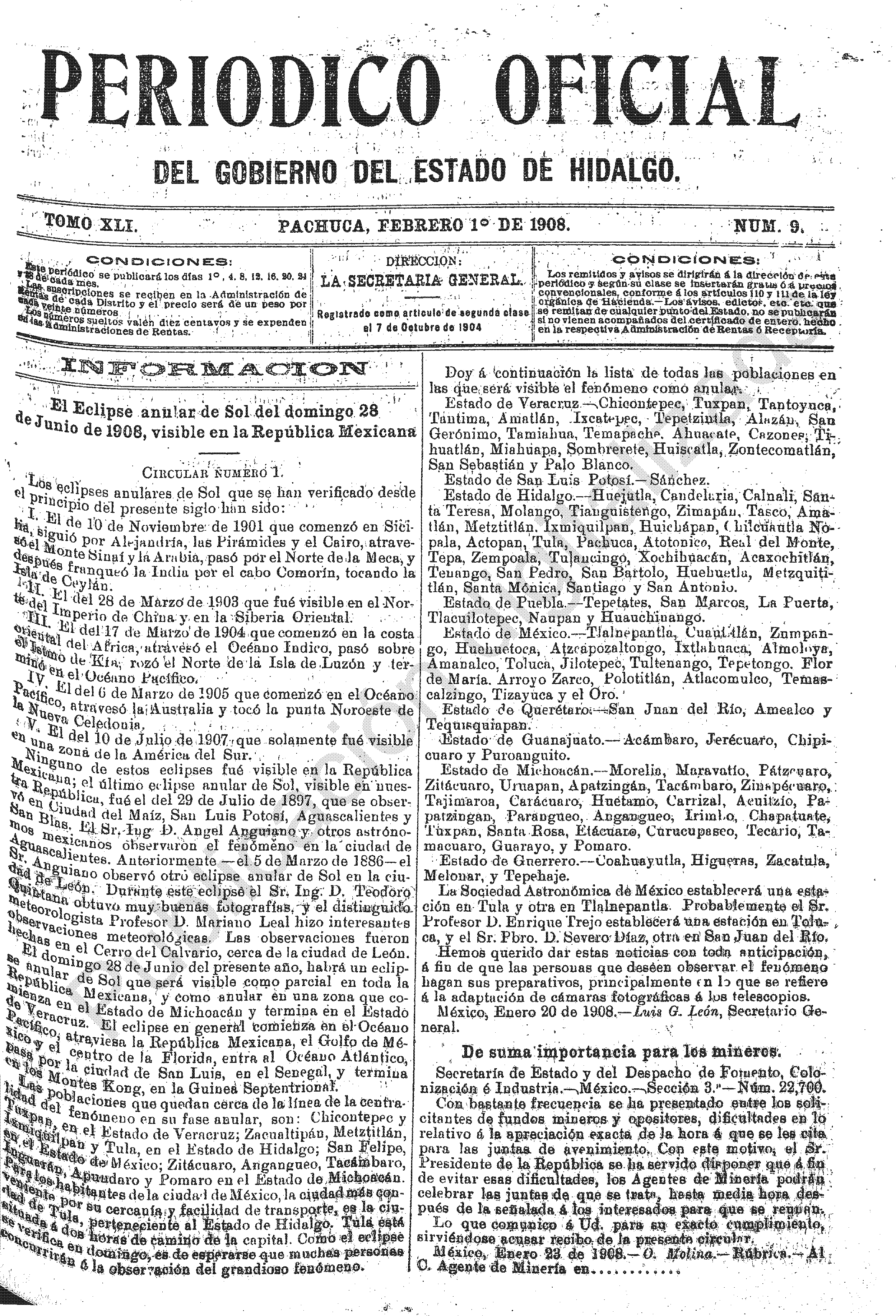 • El Eclipse anular de Sol del domingo 28 de junio de 1908, visible en la República Mexicana.