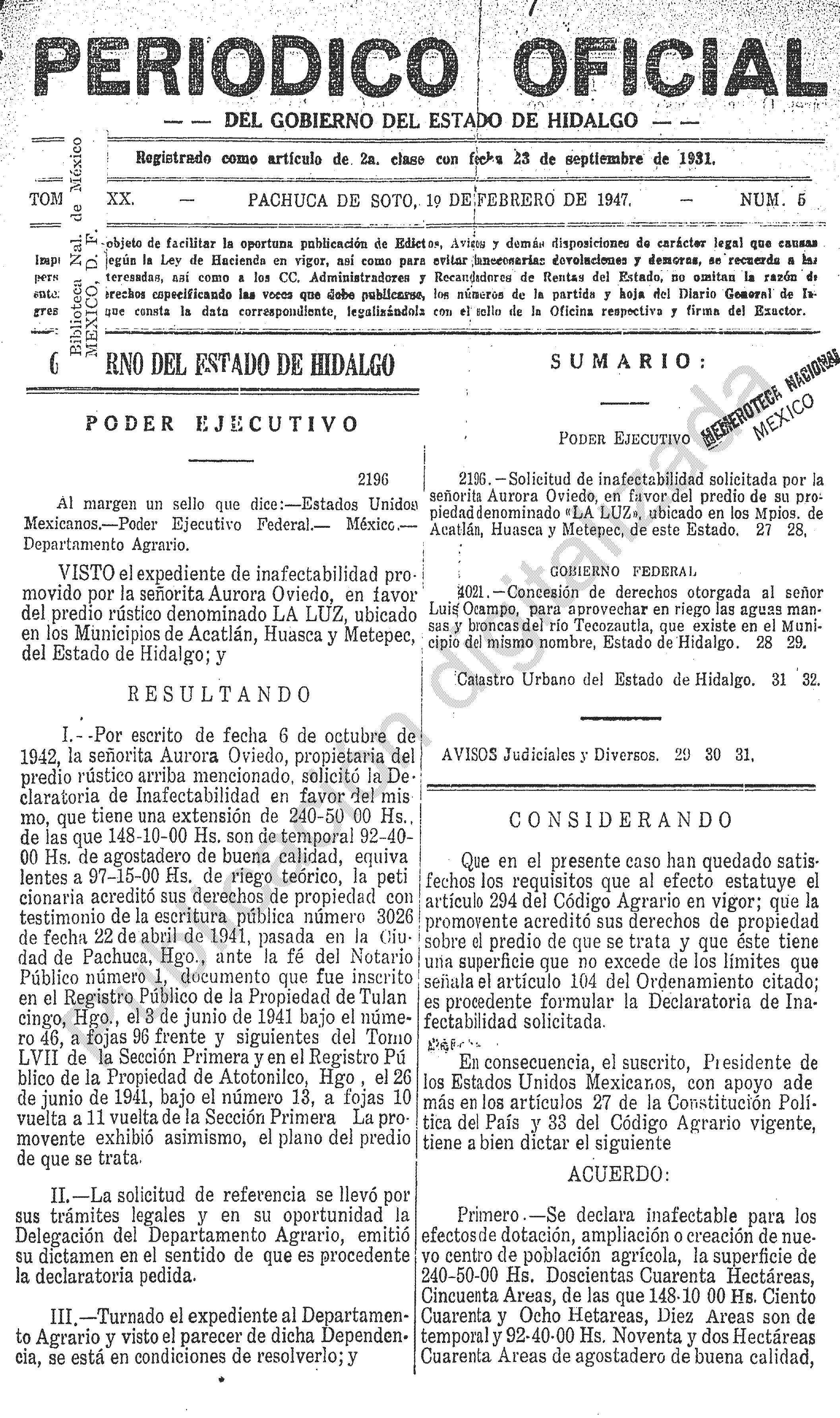 Descargar Periódico Oficial Ordinario 0 del 01 de febrero de 1947