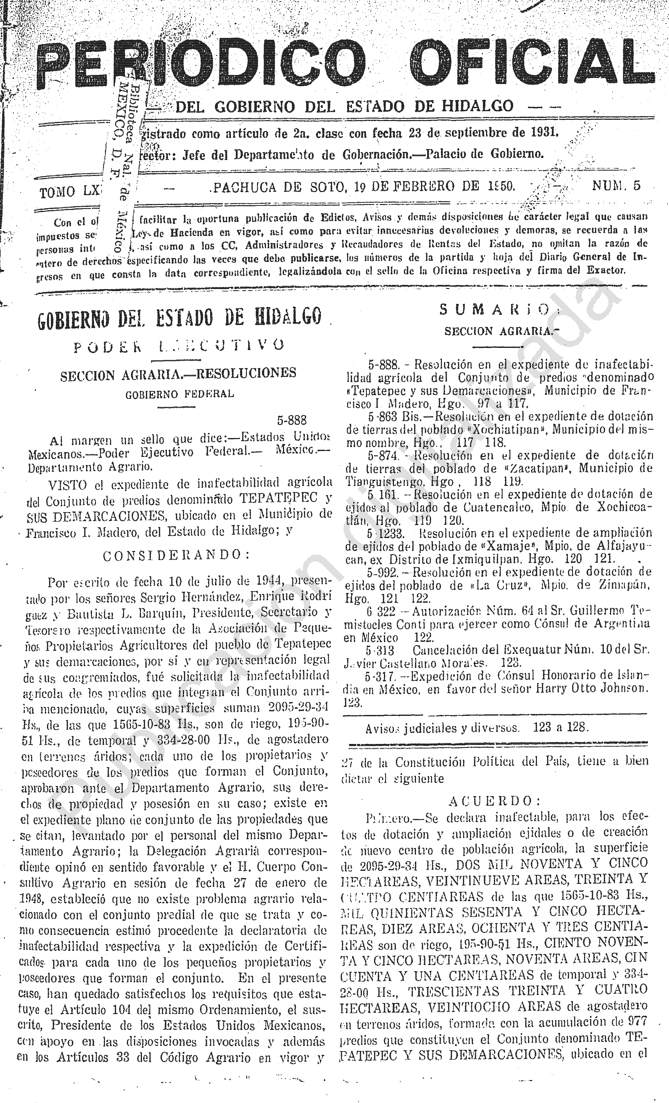 - 5-888.- Resolución en el expediente de inafectabilidad agrícola del Conjunto de predios denominado “Tepatepec y sus Demarcaciones”, Municipio de Francisco I. Madero, Hgo.
