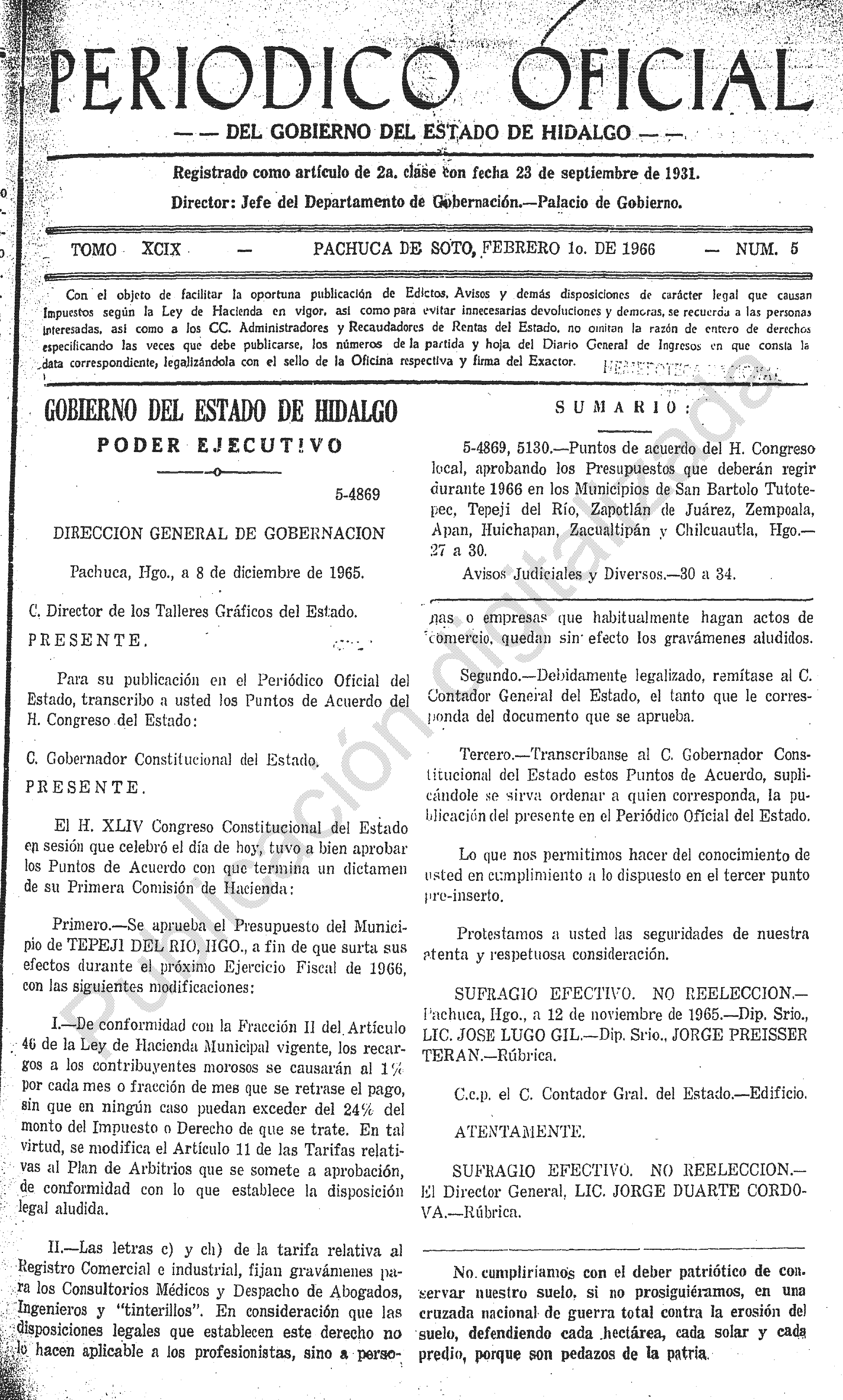 - 5-4869, 5130.- Puntos de acuerdo del H. Congreso local, aprobando los Presupuestos que deberán regir durante 1966 en los Municipios de San Bartolo Tutotepec, Tepeji del Río, Zapotlán de Juárez, Zempoala, Apan, Huichapan, Zacualtipán y Chilcuautla, Hgo.