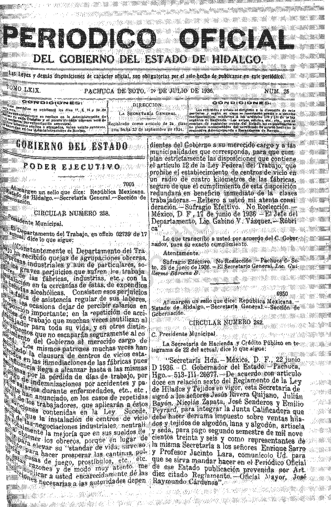 - 7001.- Secretaría General, Sección de Gobernación publica Circular Número 258.