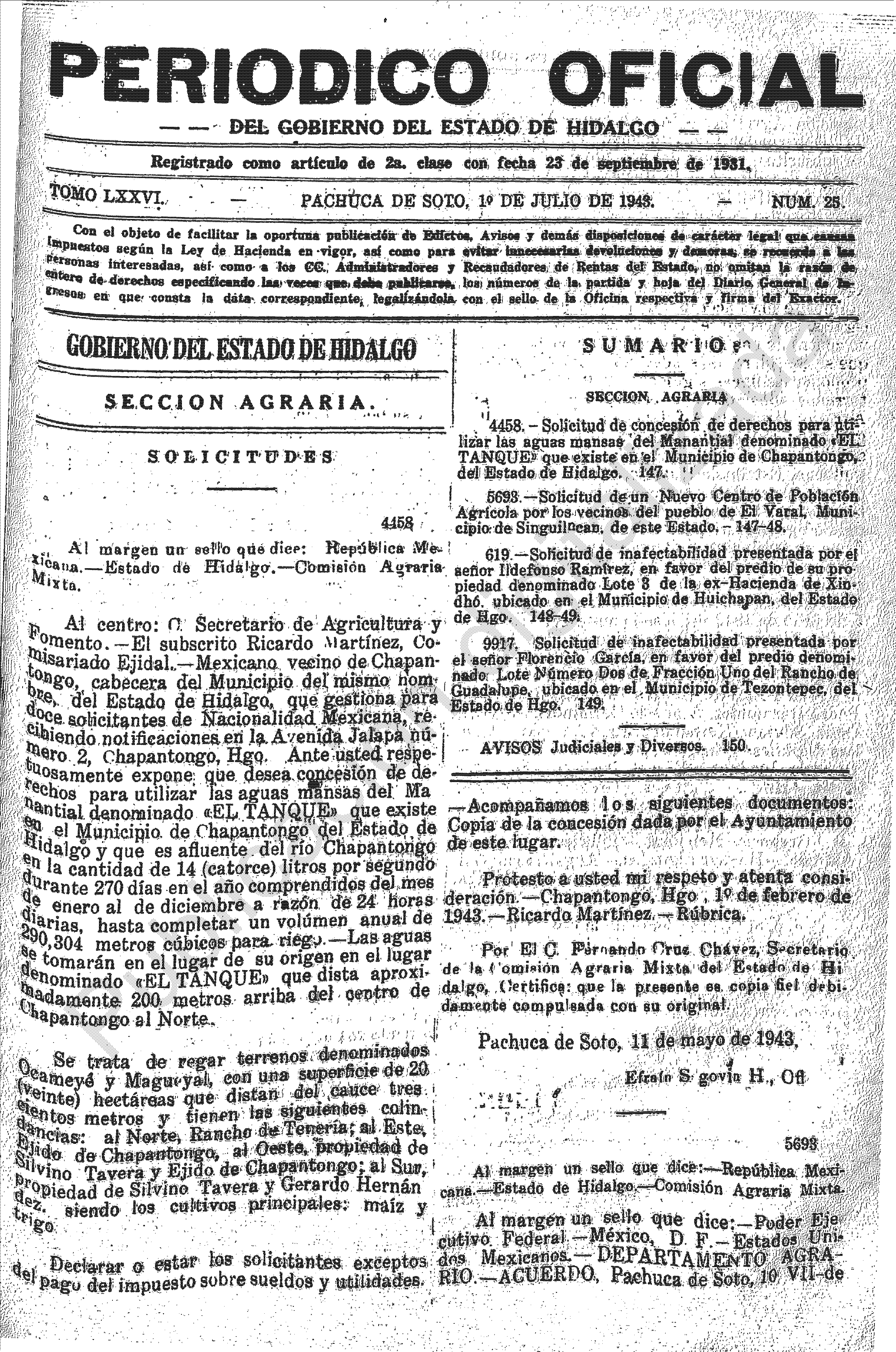 • 4458.- Solicitud de concesión de derechos para utilizar las aguas mansas del Manantial denominado “EL TANQUE” que existe en el Municipio de Chapantongo, del Estado de Hidalgo.