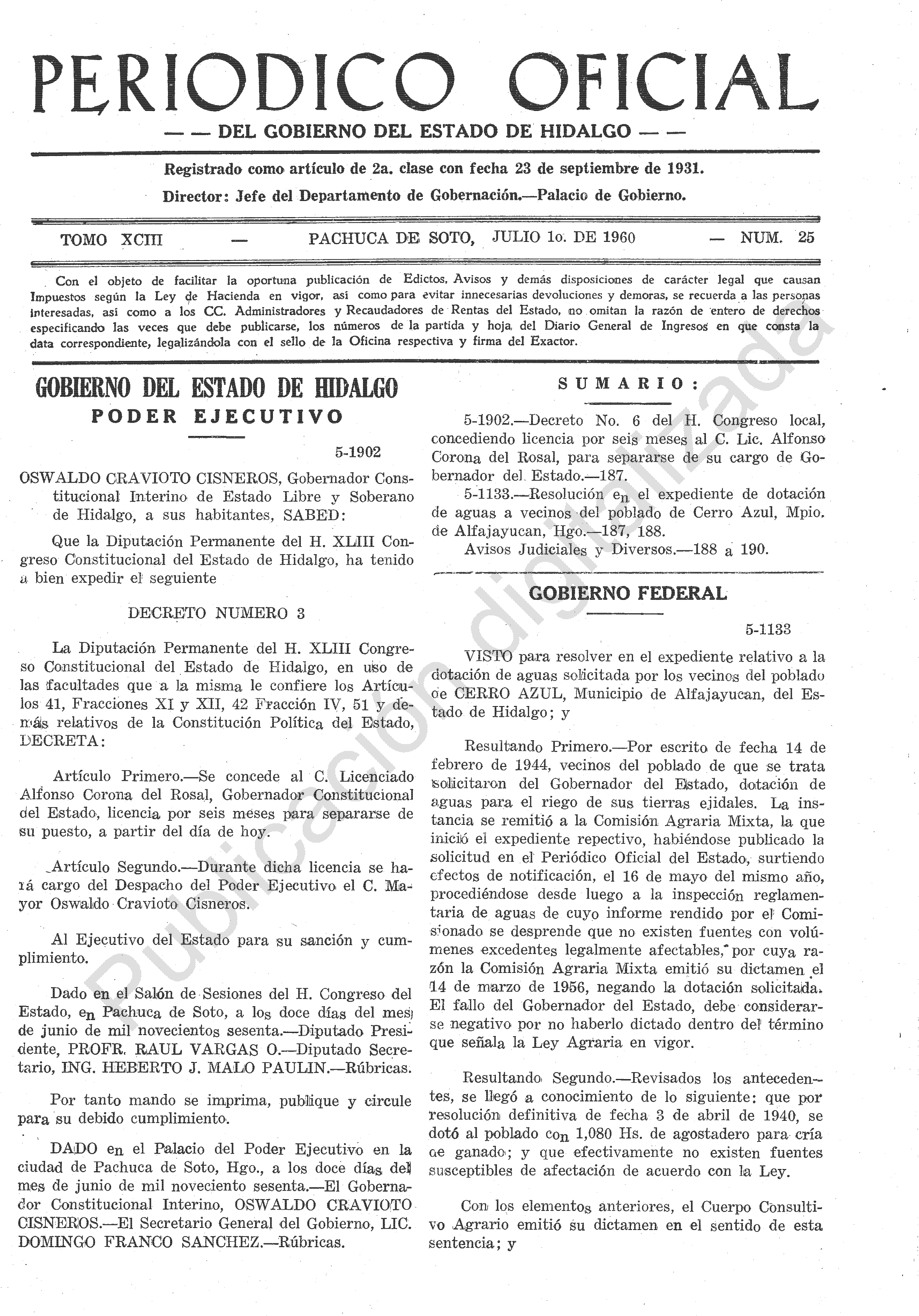 Descargar Periódico Oficial Ordinario 0 del 01 de julio de 1960