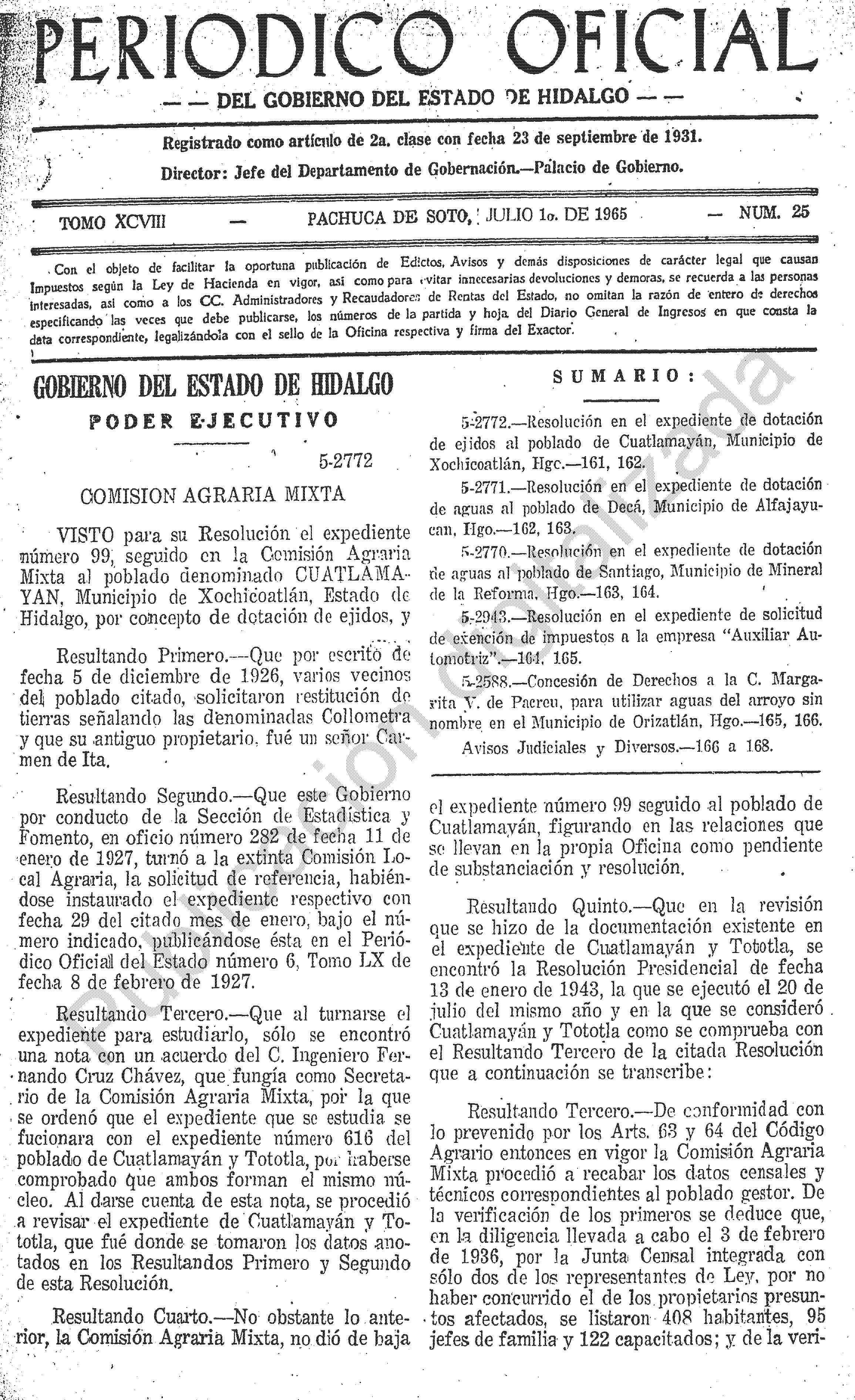 - 5-2772.- Resolución en el expediente de dotación de aguas al poblado Cuautlamayán, Municipio de Xochicoatlán, Hgo.