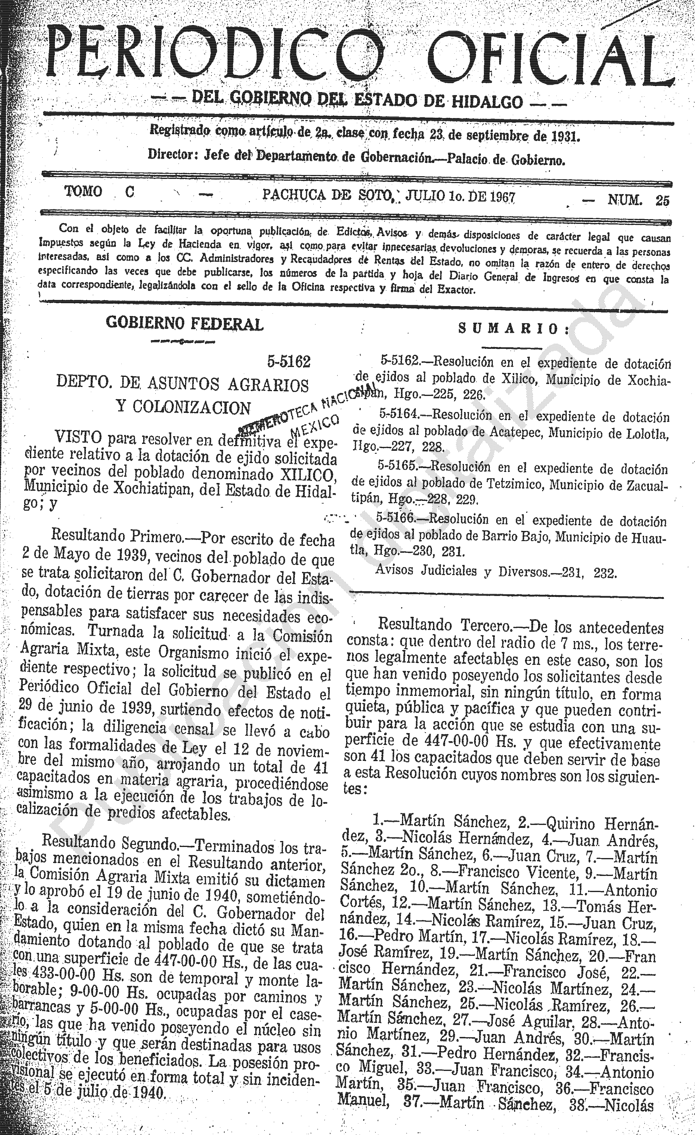 • 5-5162.- Resolución en el expediente de dotación de ejidos al poblado de Xilico, Municipio de Xochiatipan, Hgo.