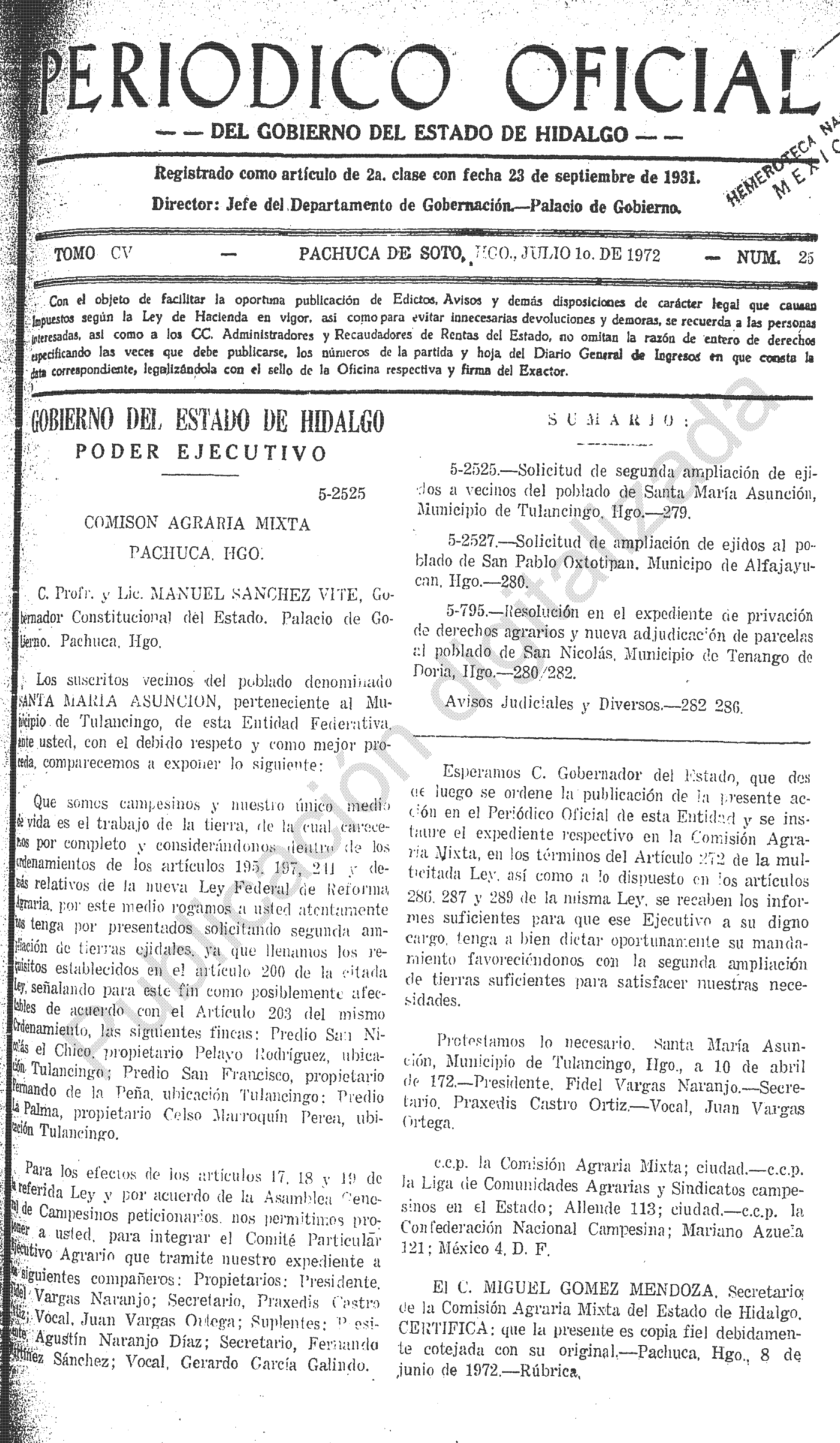 - 5-2525.- Solicitud de segunda ampliación de ejidos a vecinos del poblado de Santa María Asunción, Municipio de Tulancingo, Hgo.