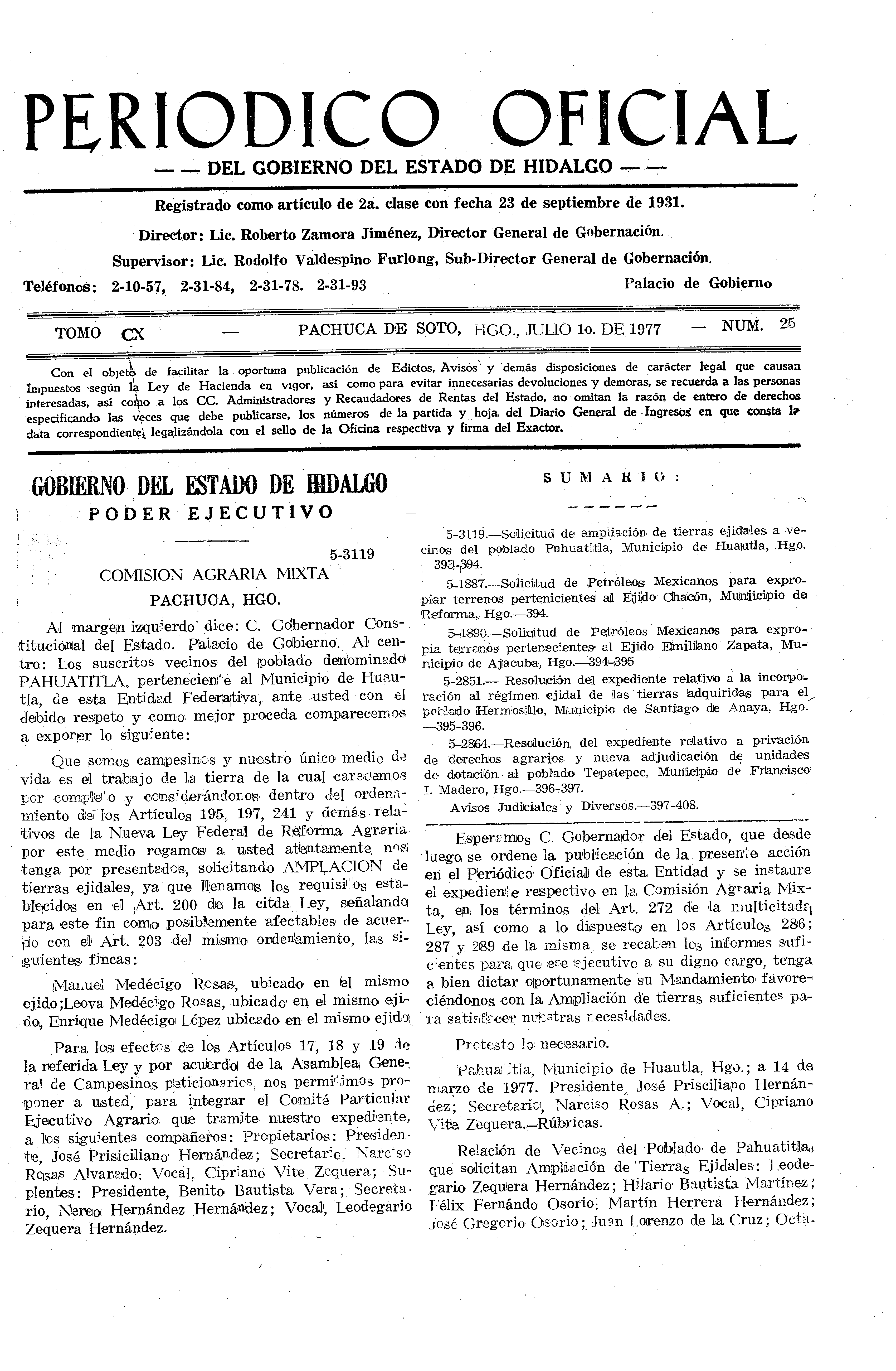 • 5-3119.- Solicitud de ampliación de tierras ejidales a vecinos del poblado Pahuatitla, Municipio de Huautla, Hgo.