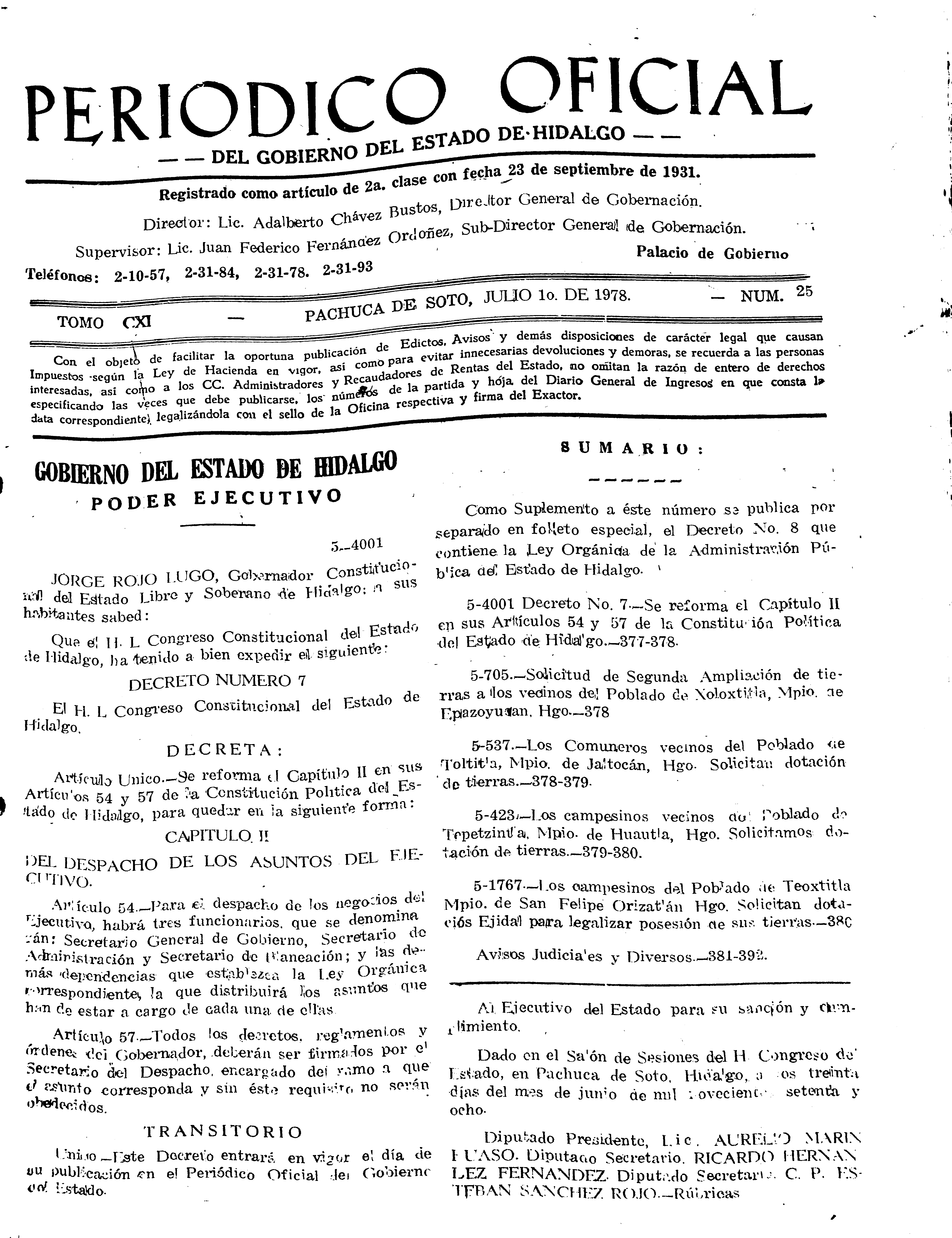 - 5-4001 Decreto No. 7.- Se reforma el Capítulo II en sus Artículos 54 y 57 de la Constitución Política del Estado de Hidalgo.