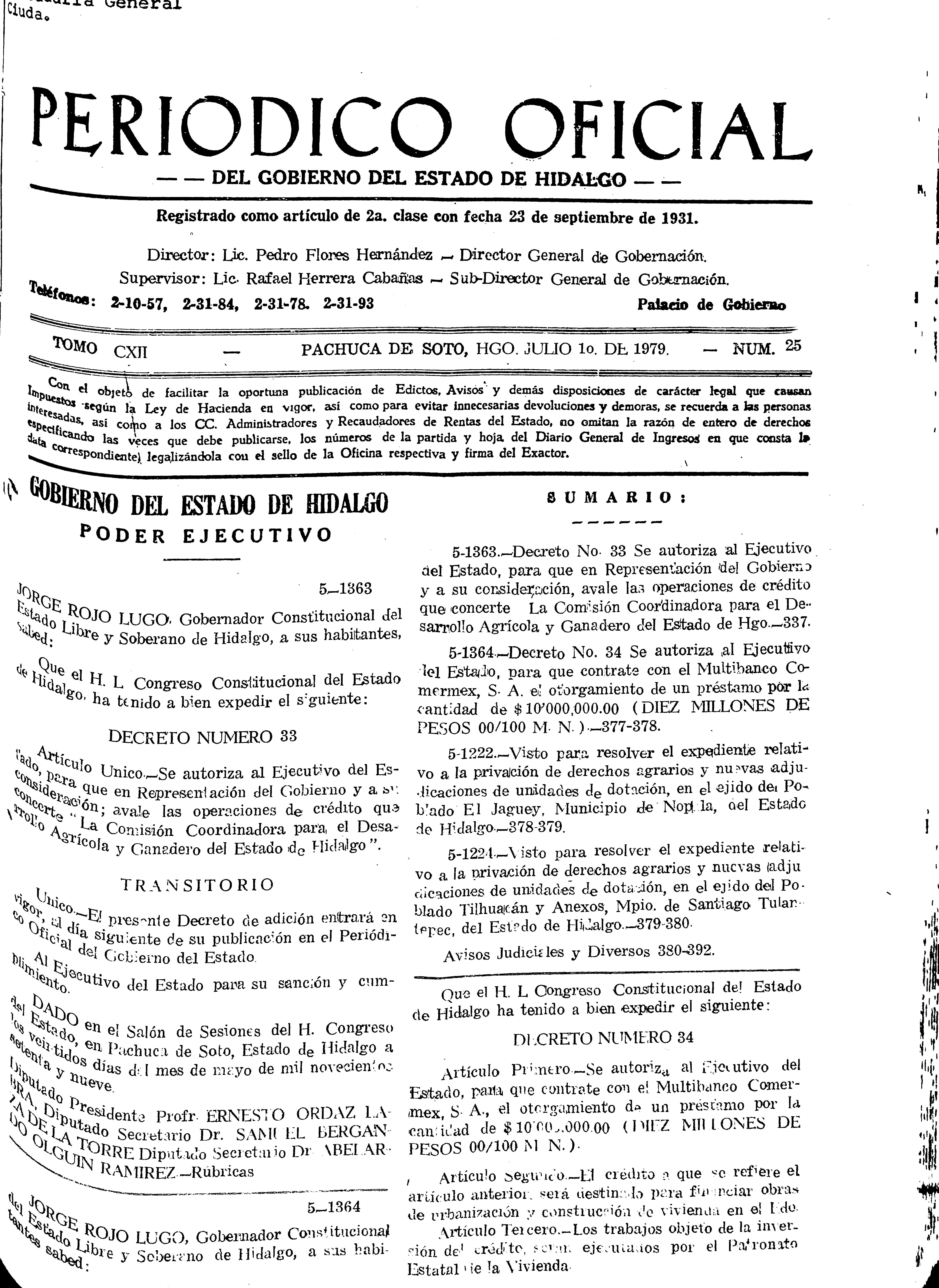 • 5-1363.- Decreto No. 33, Se autoriza al Ejecutivo del Estado, para que en Representación del Gobierno y a su consideración, avale las operaciones de crédito que concerté La Comisión Coordinadora para el Desarrollo Agrícola y Ganadero del Estado de Hgo.