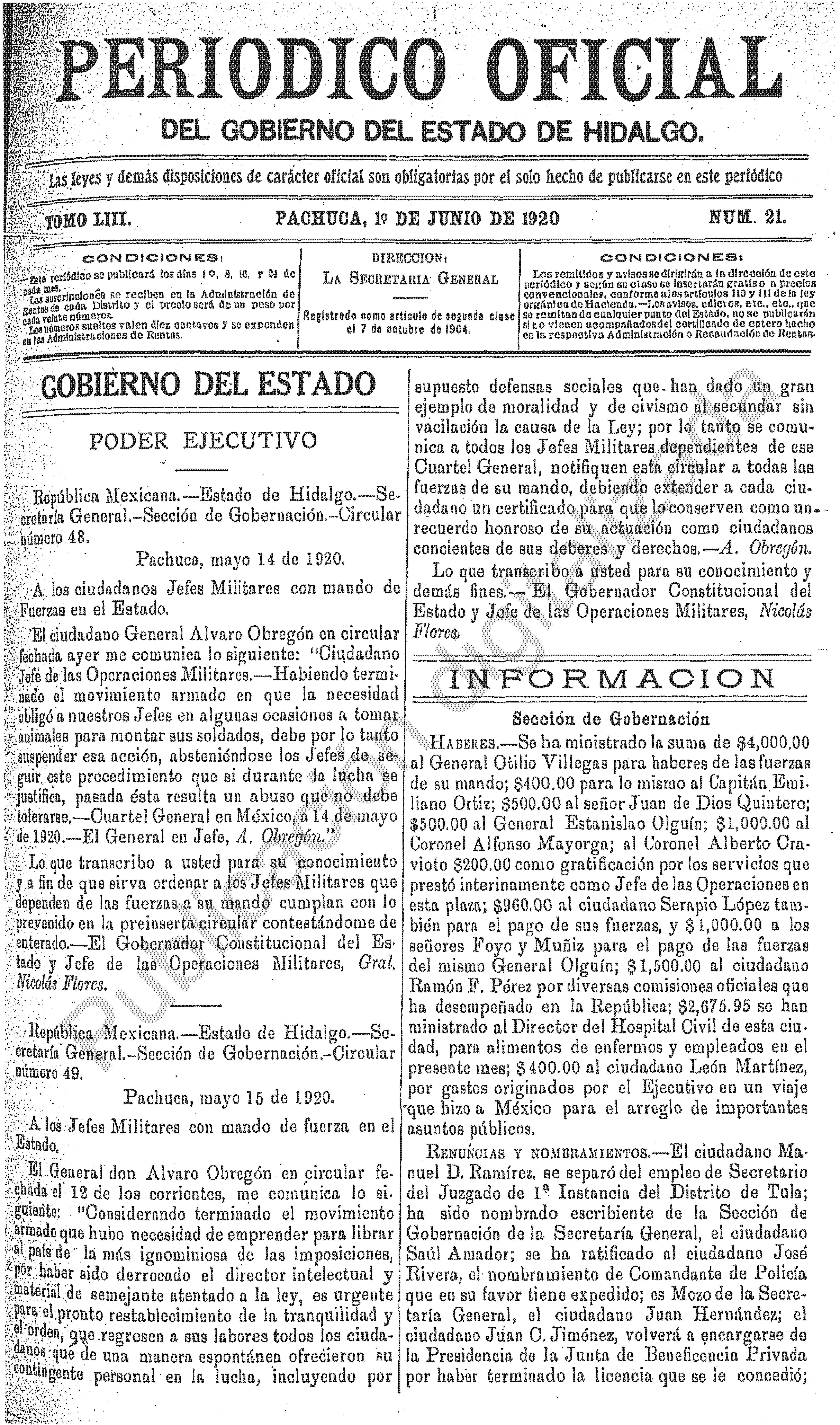 Descargar Periódico Oficial ordinario 0 del 01 de junio de 1920El portal web del Periódico Oficial del Estado de hidalgo es el único medio de difusión oficial del Gobierno del Estado de Hidalgo