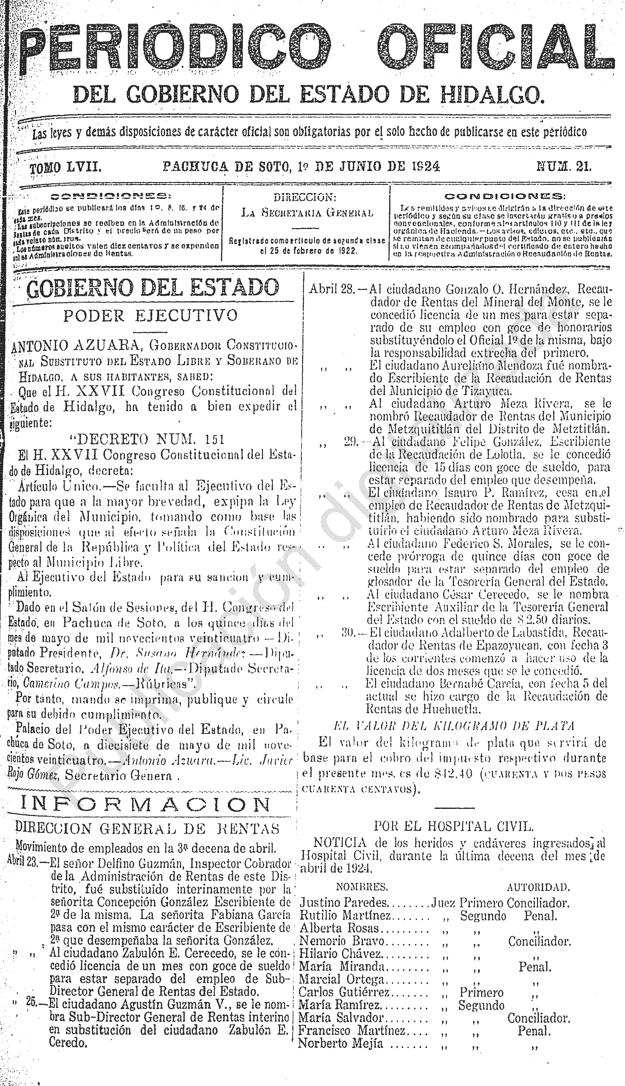 - Poder Ejecutivo.- Antonio Azuara, Gobernador Constitucional, “Decreto número 151: Se faculta al Ejecutivo del Estado para que a la mayor brevedad expida la Ley Orgánica del Municipio, tomando como base las disposiciones que el efecto señala la Constitución General de la República y Política del Estado respecto al Municipio Libre.