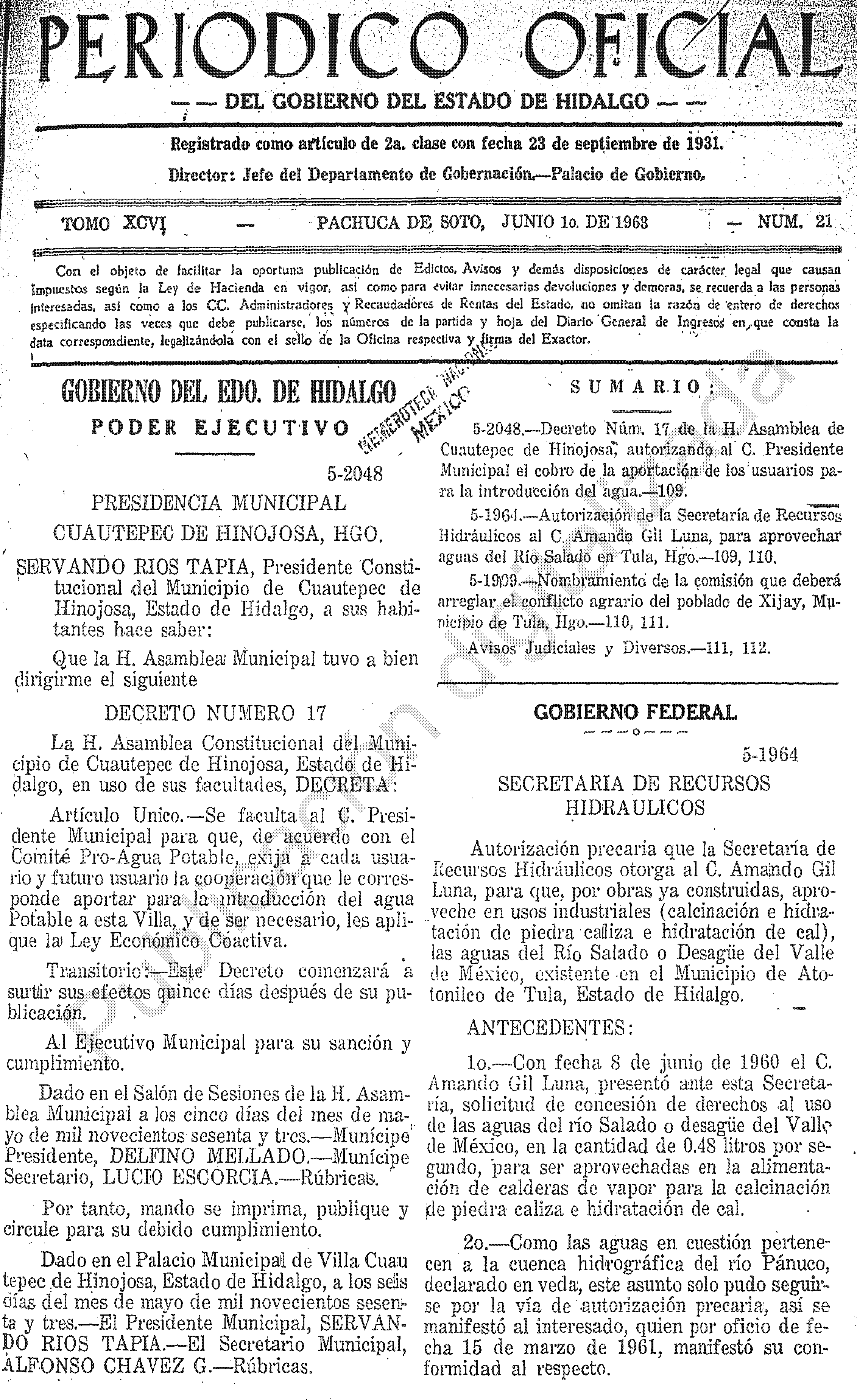 • 5-2048.- Decreto Núm. 17 de la H. Asamblea de Cuautepec de Hinojosa, autorizando al C. Presidente Municipal el cobro de la aportación de los usuarios para la introducción del agua.
