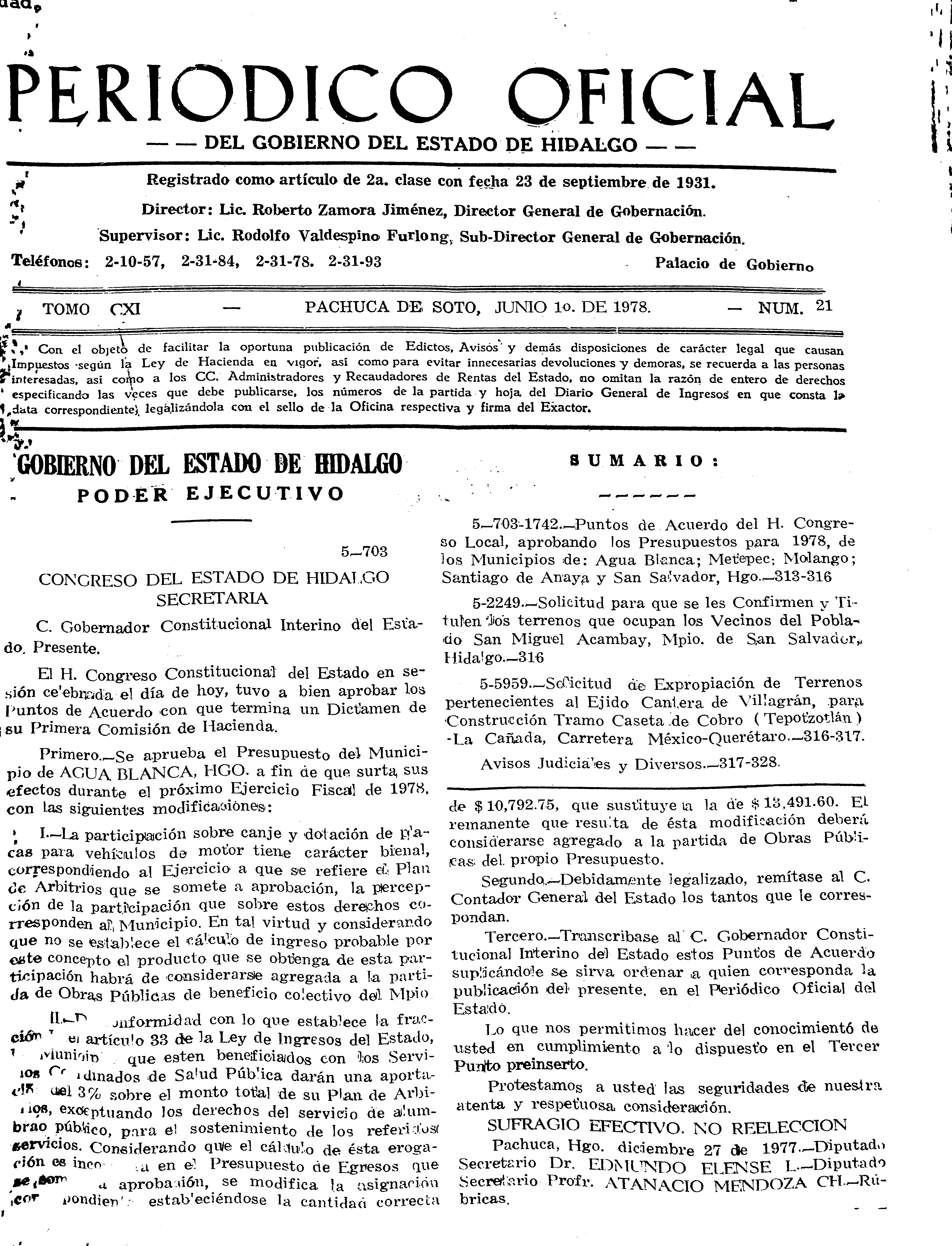 - 5-703-1742.- Puntos de Acuerdo del H. Congreso Local, aprobando los Presupuestos para 1978, de los Municipios de: Agua Blanca, Metepec, Molango, Santiago de Anaya y San Salvador, Hgo.