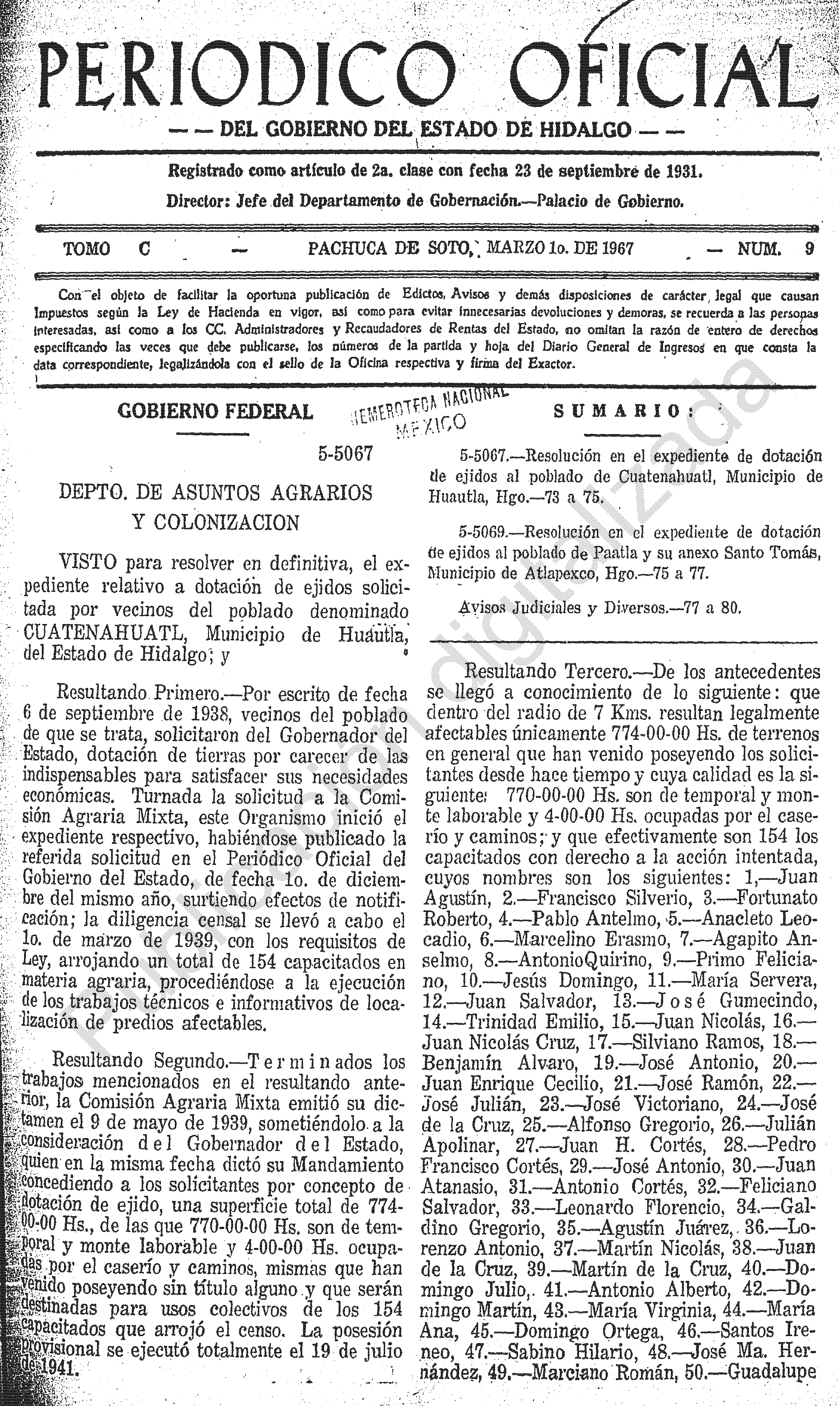 - 5-5067.- Resolución en el expediente de dotación de ejidos al poblado de Cuautenahuatl, Municipio de Huautla, Hgo.