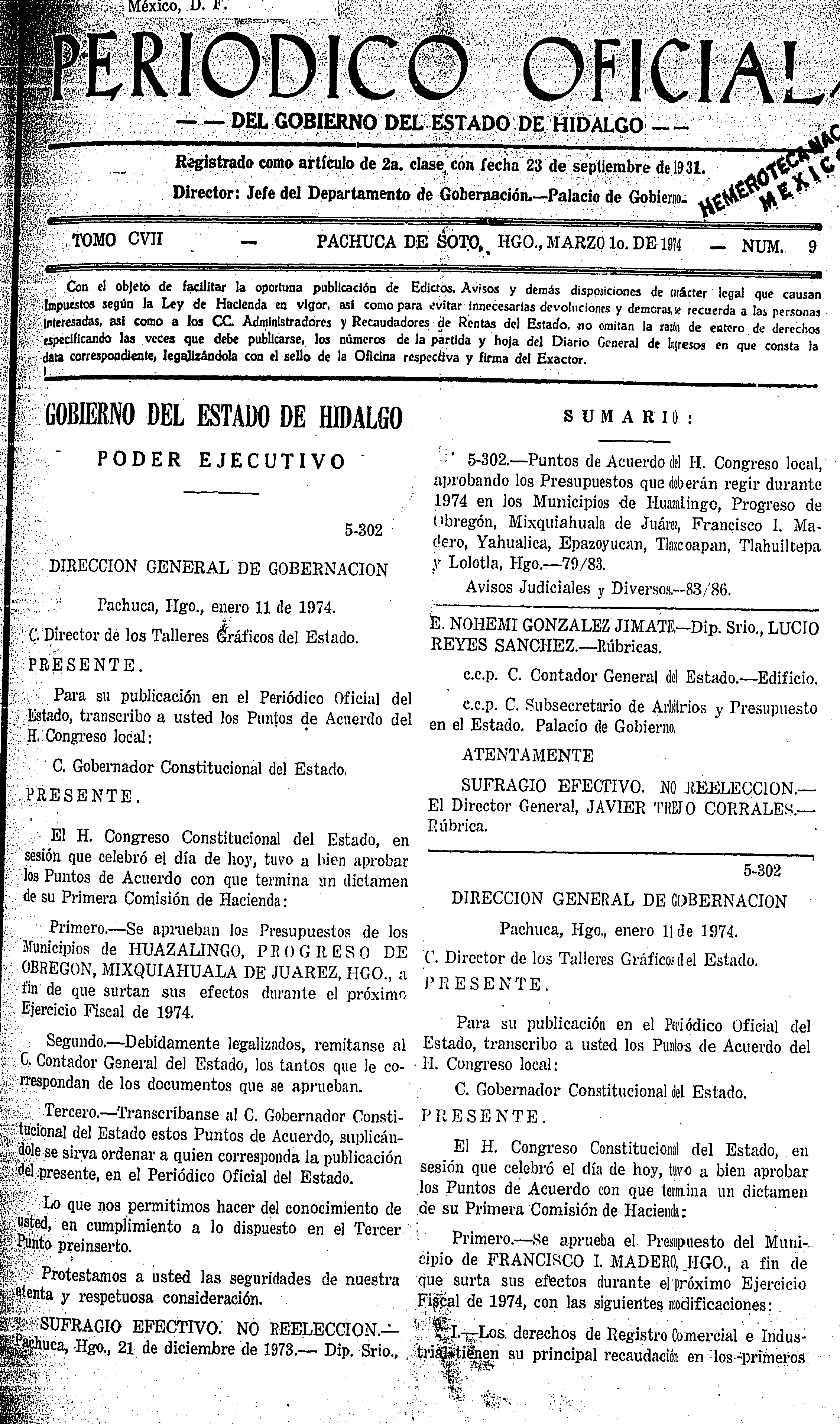 • 5-302.- Puntos de Acuerdo del H. Congreso local, aprobando los Presupuestos que deberán regir durante 1974 en los Municipios de Huazalingo, Progreso de Obregón, Mixquiahuala de Juárez, Francisco I. Madero, Yahualica, Epazoyucan, Tlaxcoapan, Tlahuiltepa y Lolotla, Hgo.