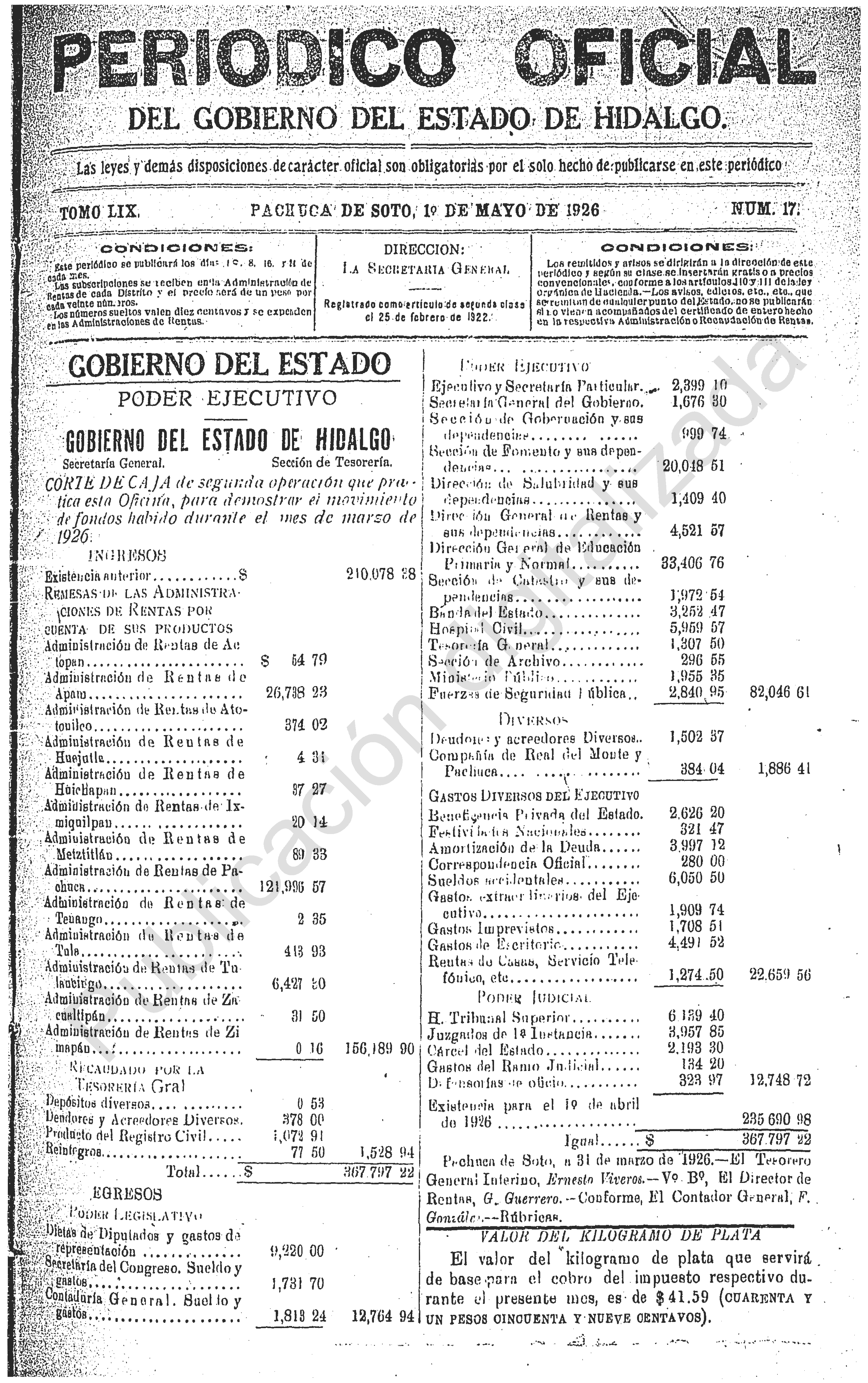 Descargar Periódico Oficial Ordinario 0 del 01 de mayo de 1926Tamaño 1.15 MB